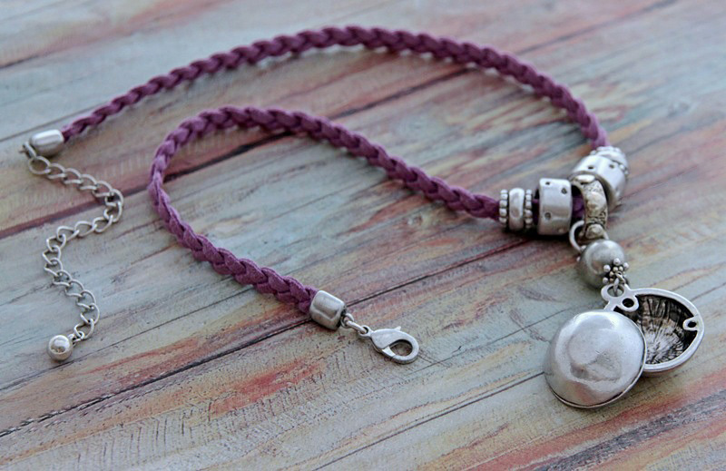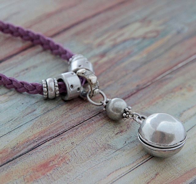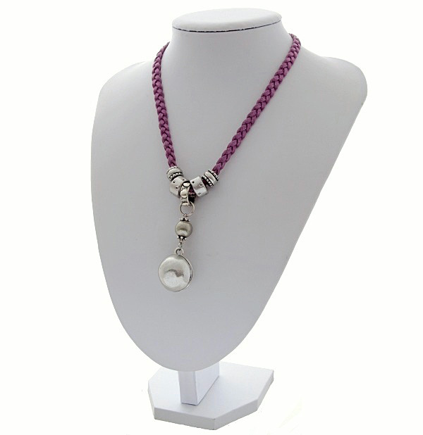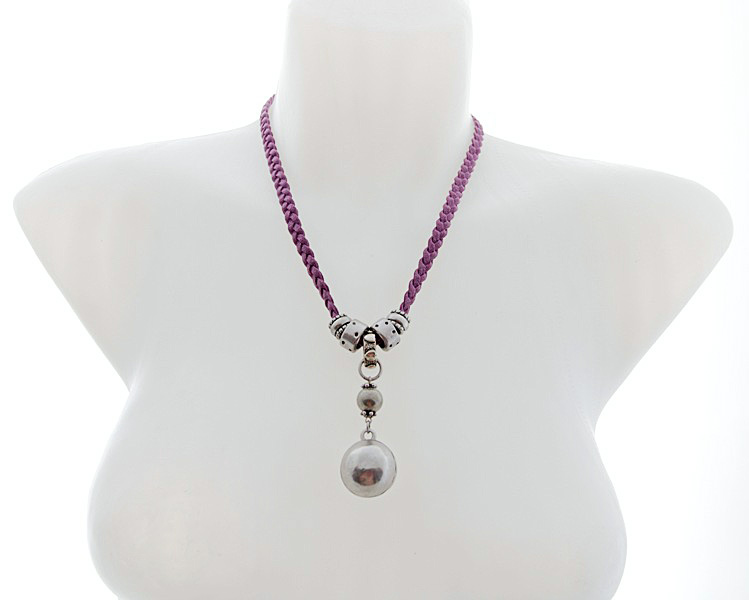 Seemisnahkse punutud lilla paela ja vanahõbedavärvi metalldetailidega rahvuslikus stiilis kaelaehe suure lahtikäiva “munaga”. Lahtikäiva “muna” läbimõõt on 2,5 cm. Ripatsi üldpikkus on 5,5 cm. Kaelaehte pikkus on reguleeritav karabiinhaagiga 42 cm-st 48 cm-ni