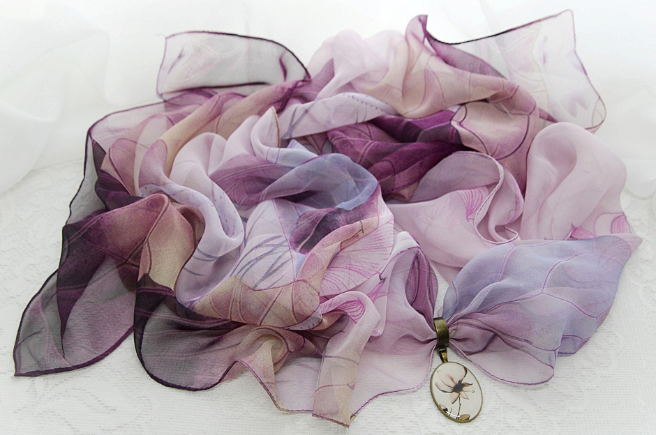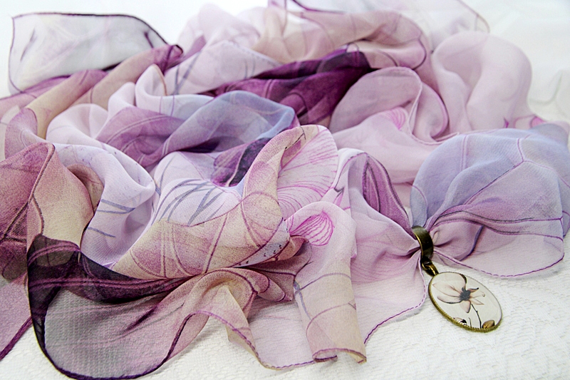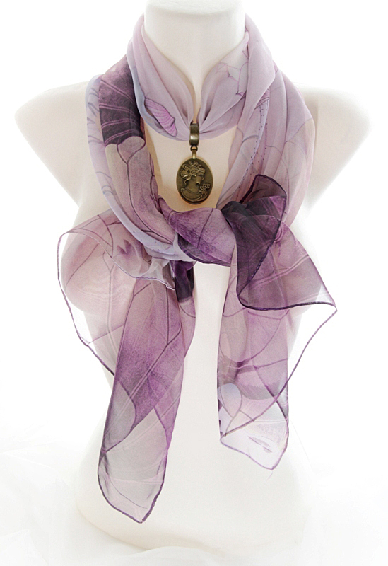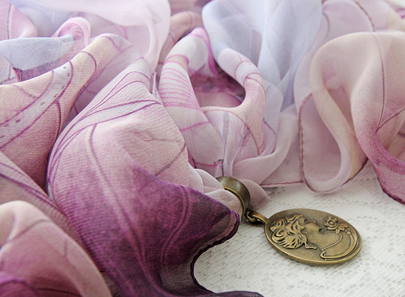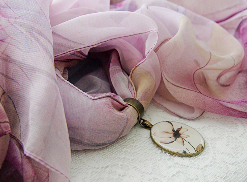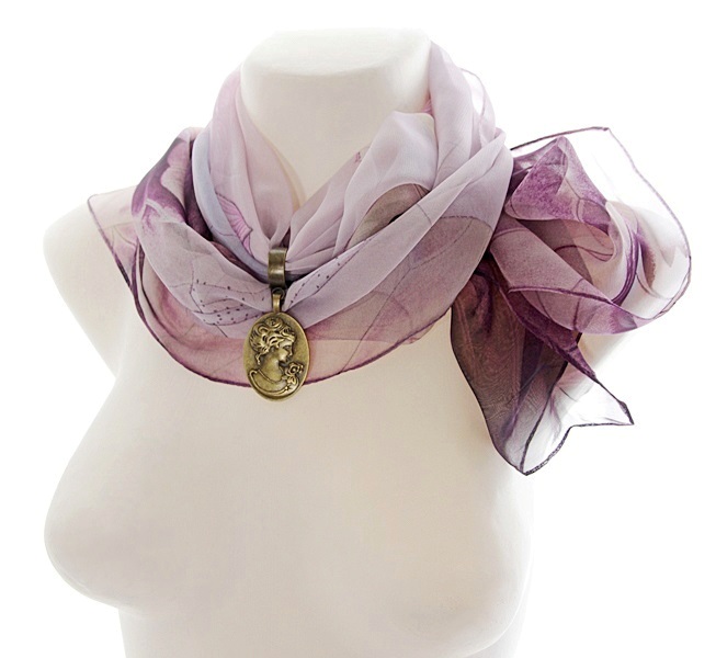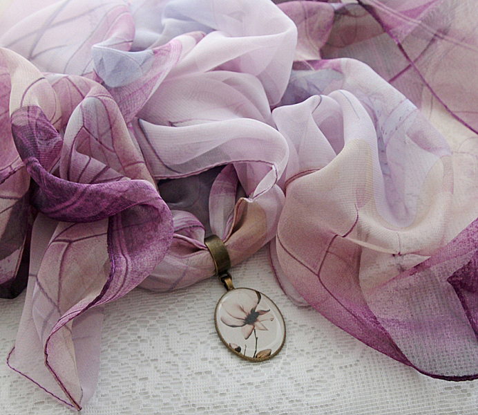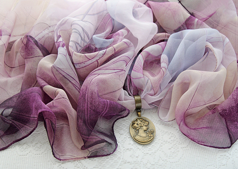 Lillades-beežides toonides õhulisest ja hästilangevast polüesterkangast sall väikese pronksivärvi sallirõnga ja kahepoolselt kantava vintage stiilis ripatsiga. Metallripatsi ühel poolel on reljeefne renessansiaja daami portree, teisel poolel kristallvaiguga kaetud salli mustriga sobiv lilleõie motiiviga foto.