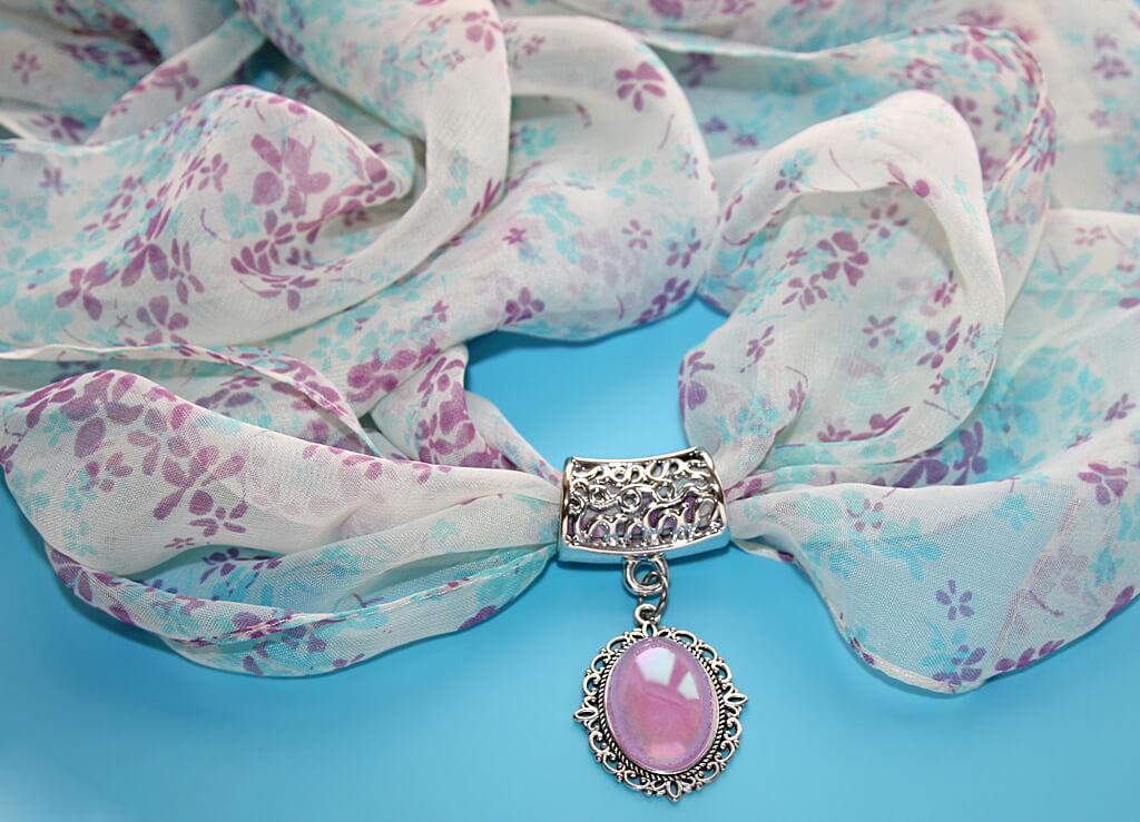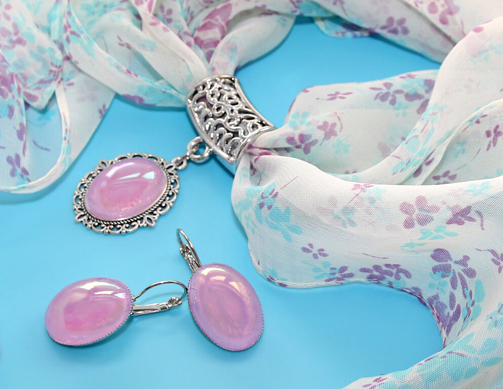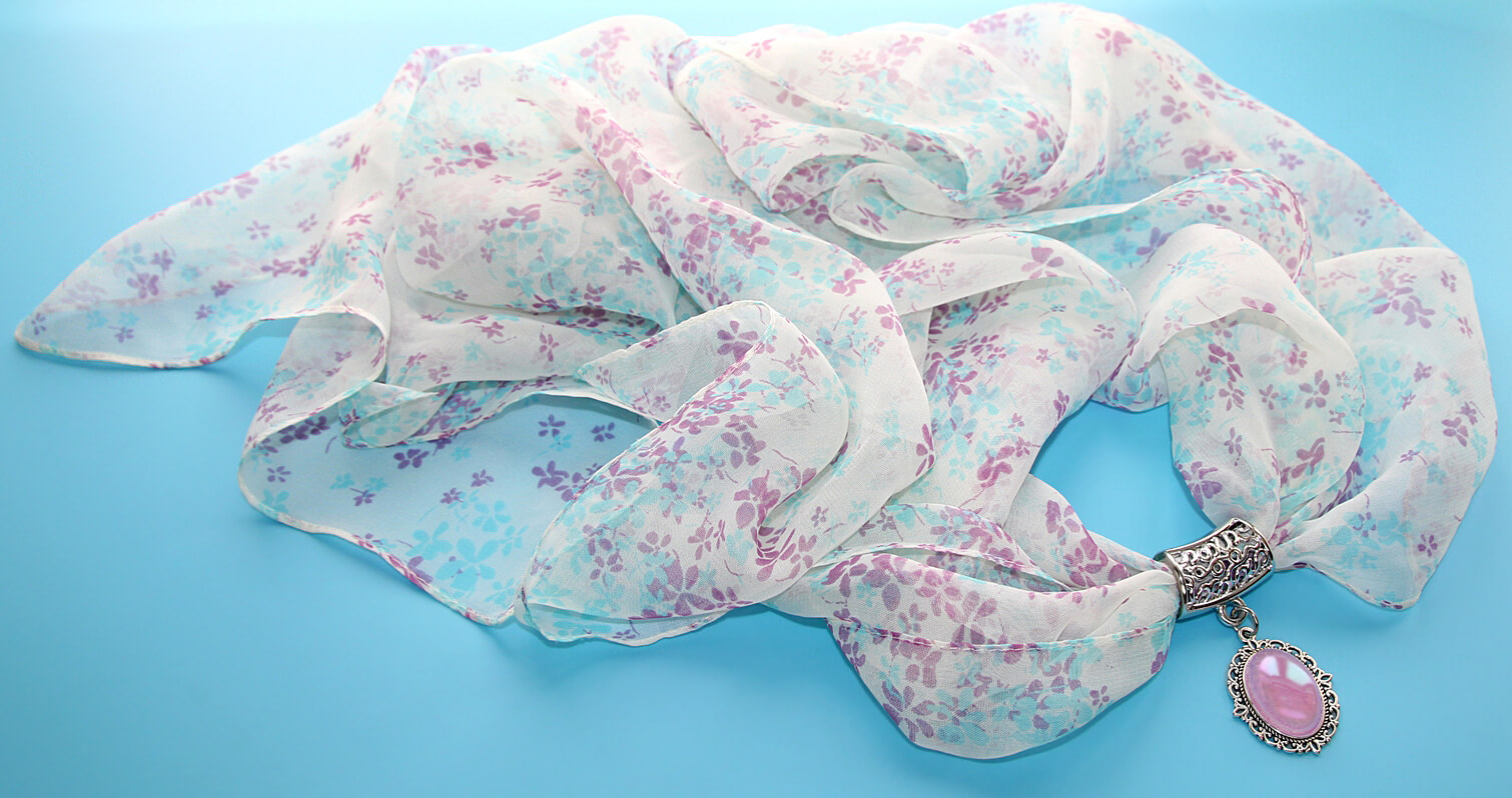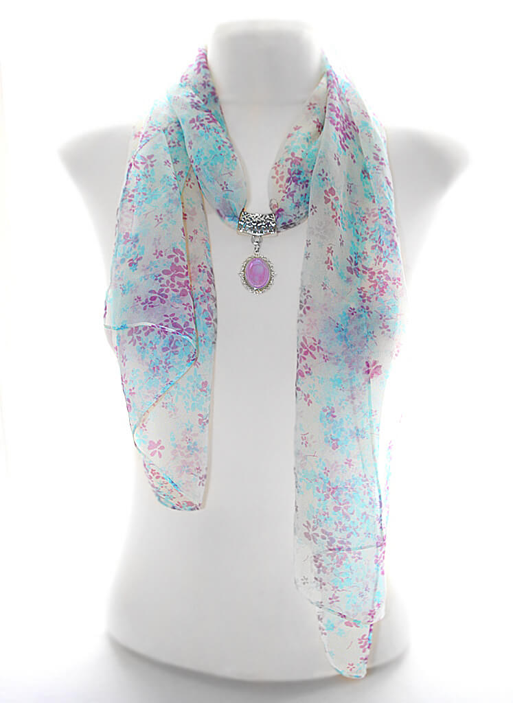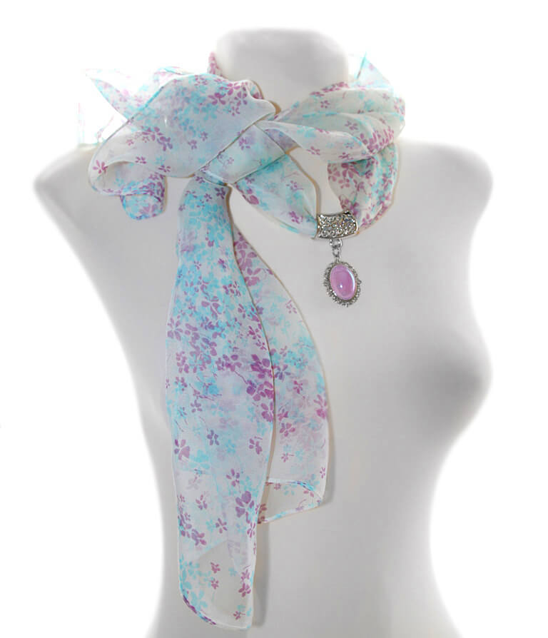 Väikeste helesiniste ja lillade lillekestega õhulisest polüesterkangast valge sall komplektis helelilla kameega kaunistusripatsi ja kõrvarõngastega.