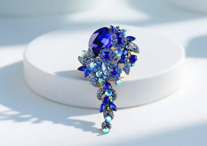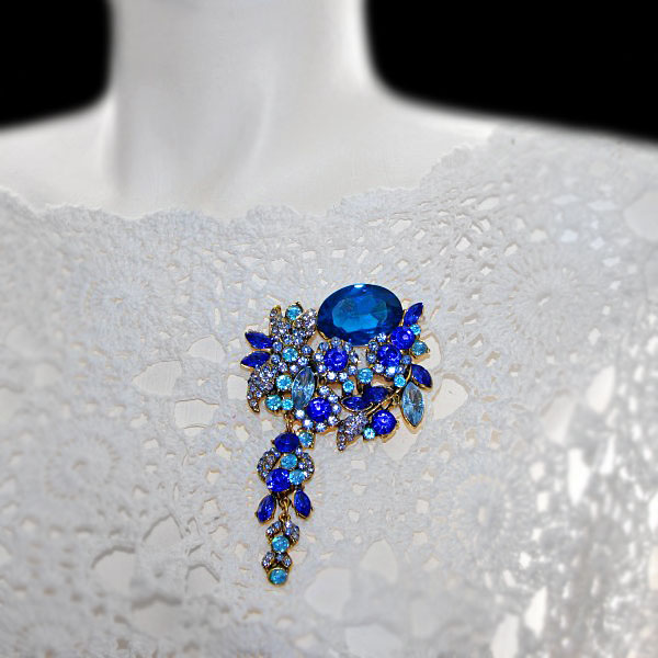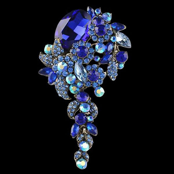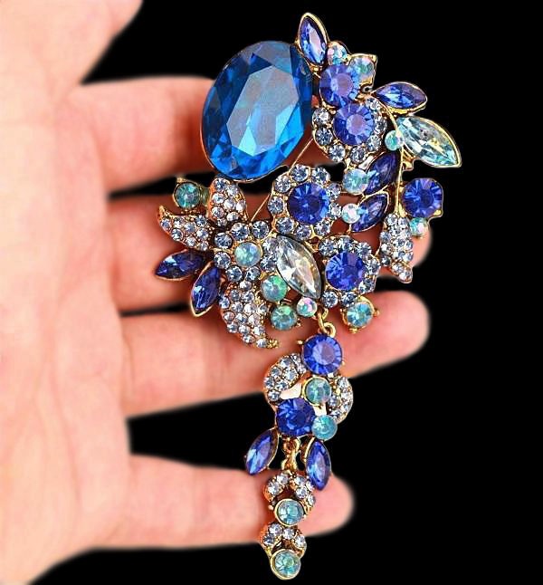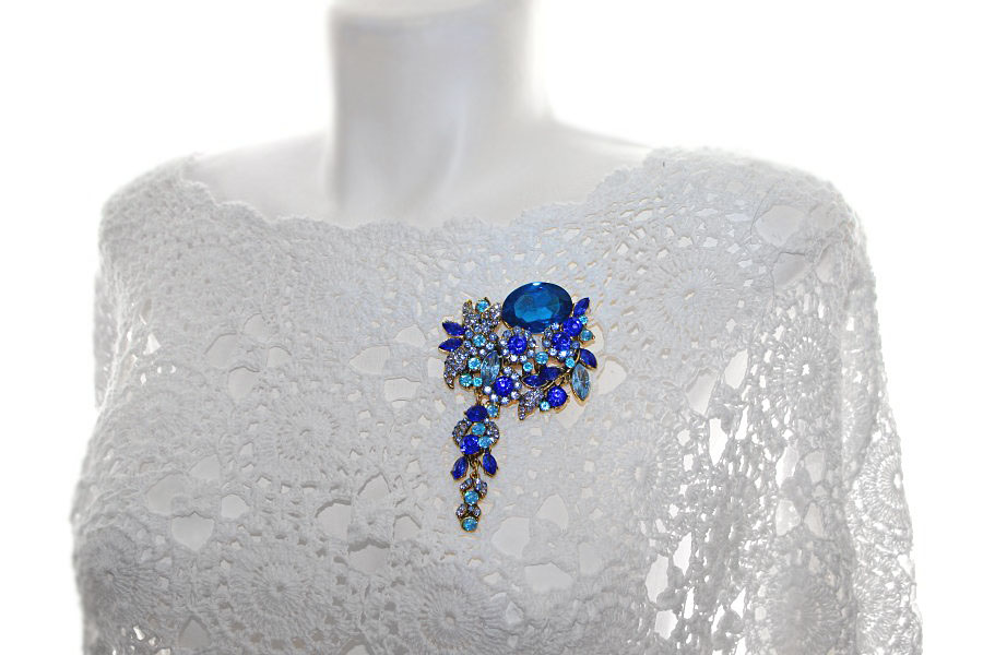Erinevas suuruses ja värvitoonis säravate sinistes toonides klaaskristallidega kaunistatud lillemotiividega suuremat sorti kullavärvi pross.