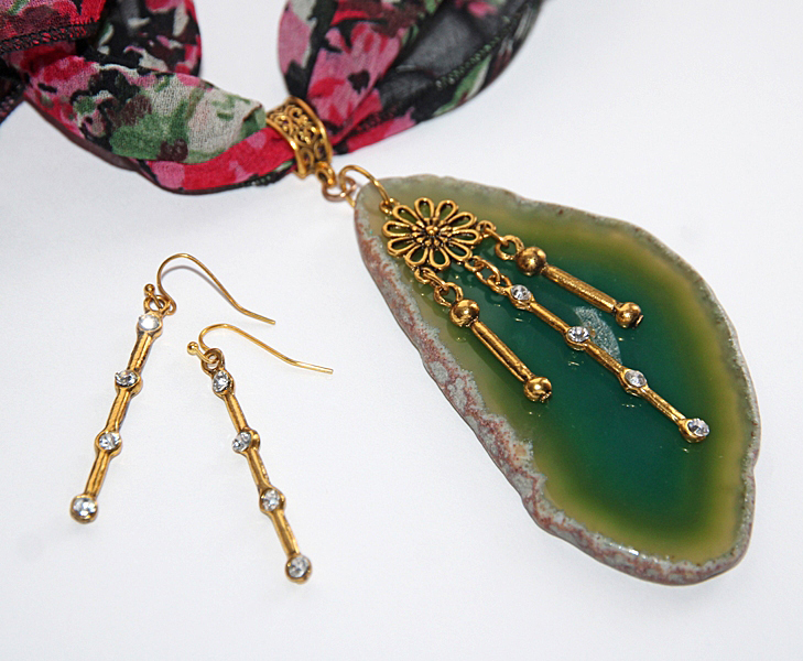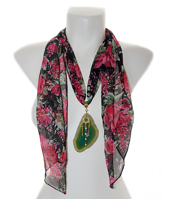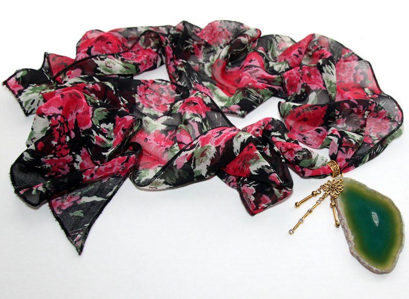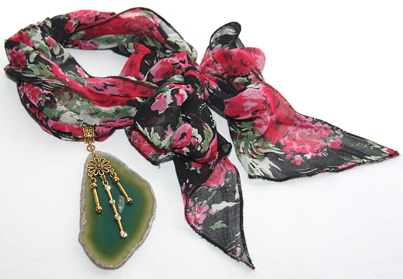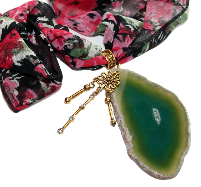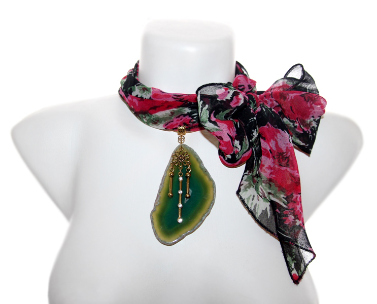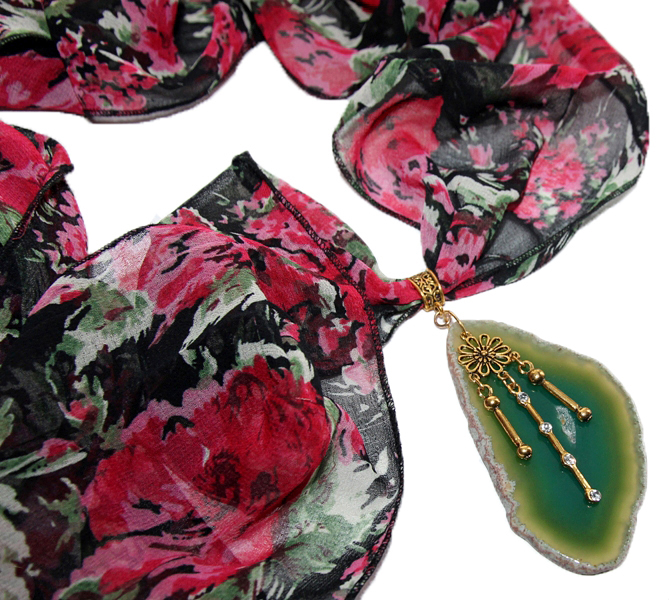 Musta värvi lillemustrilisest polüesterkangast sall väikese antiik-kuldset värvi ripatsikinnise ja suure naturaalse ahhaadiga. Roheliseks toonitud suure, kergelt läbikumava kivi mõõdud on 5 cm x 9 cm. Sall on üsna kitsas ning salli kangas kenasti langev, mistõttu saab salli otsad kinnitada kas efektseks seoseks. Kui salli otsad siduda kuklale, saab tekitada kandmiseks efektse “kaelakee”.