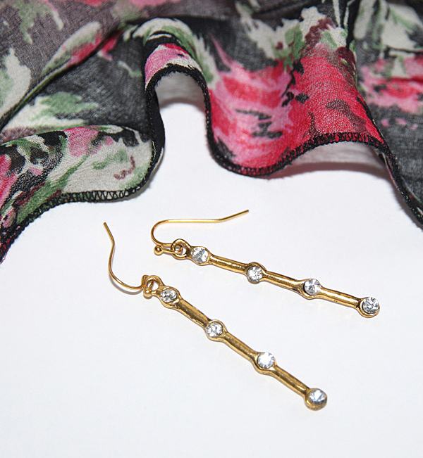 Komplekti kuuluvate valgete klaaskristallidega kaunistatud “pulkripatsitega” kõrvarõngaste pikkus koos väikese kullavärvi konksuga on 5,5 cm.