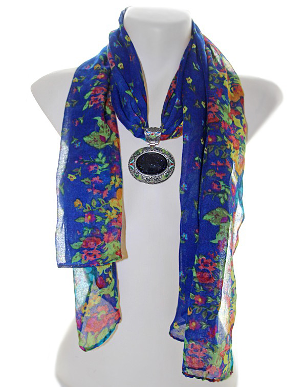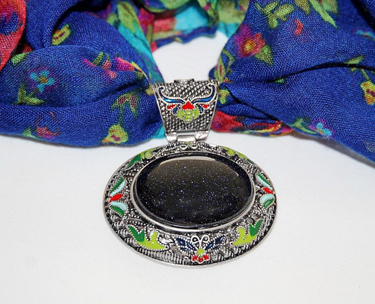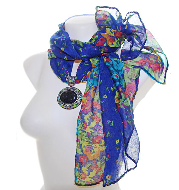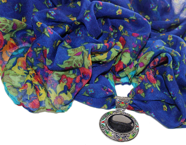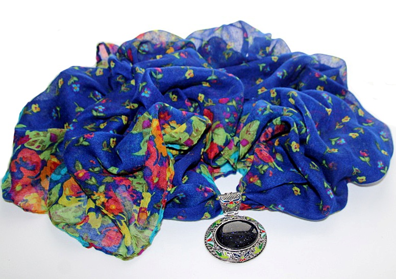 Erksat sinist värvi põhjaga lillemustriline õhuke sall suure sinisest kuldkivist kameeripatsiga.