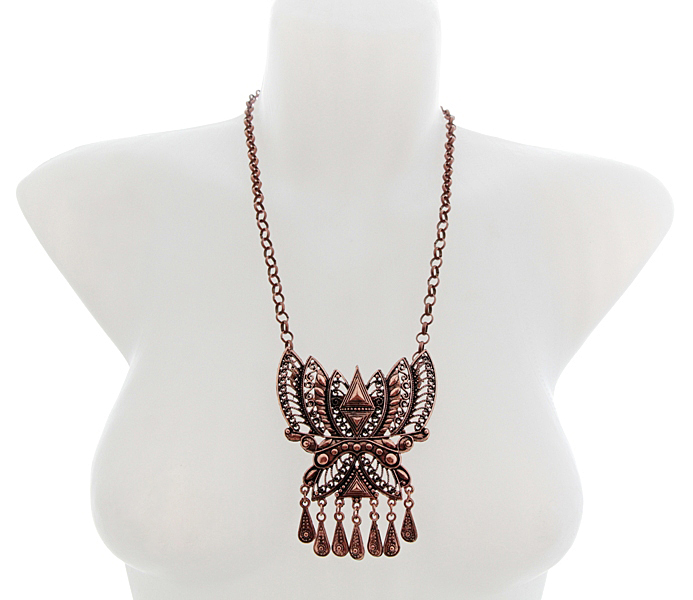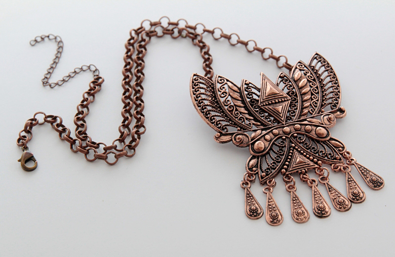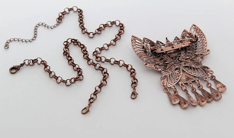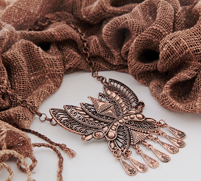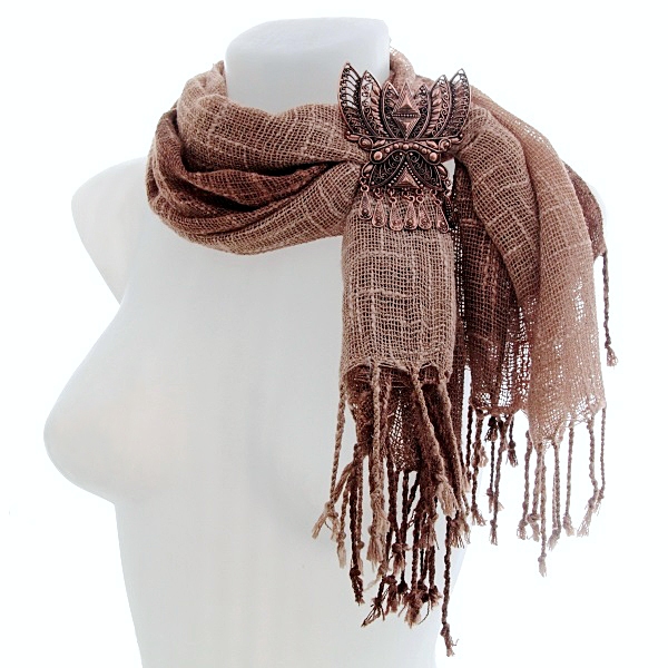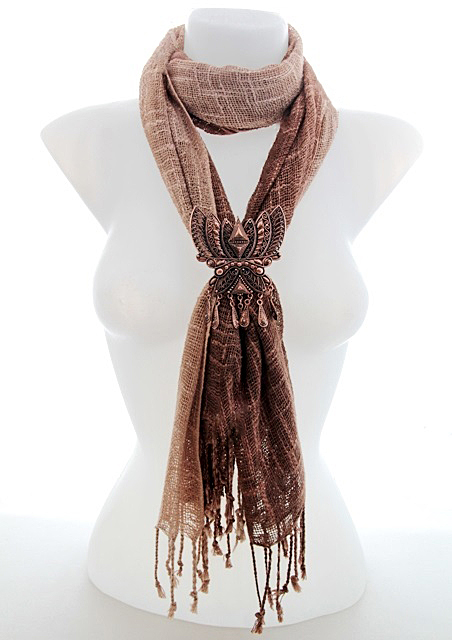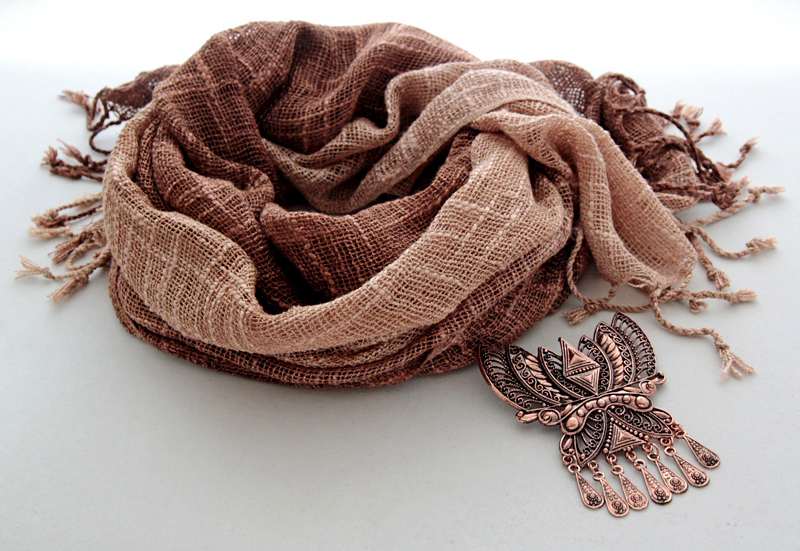 Pruunides sulanduvates toonides hõredakoeline 100% linane narmastega sall suure etno stiilis vasevärvi metallkaunistusega. Metallkaunistustusel on tagaküljel kaks aasakest ja kinnitusnõel ning kaunistust saab kanda nii prossina kui kaelakeena kas koos või ka ilma sallita. Kaelakeena kandmiseks on komplektis kaasas kaks väikese karabiinhaagiga jämedamat ketti, mis kummalegi poole aasakese külge kinnituvad. Kuid soovi korral võib mõlemast aasakesest ka näiteks nahkpaela läbi pista ja kanda kaunistust kaelas paelaga. Salli mõõdud (koos narmastega) on 55 cm x 160 cm