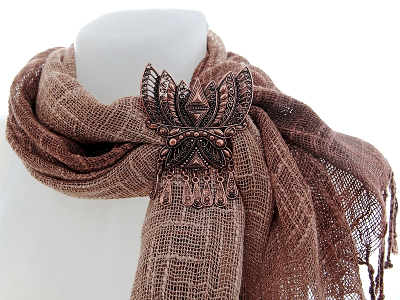 Pruunides sulanduvates toonides linane sall suure etno stiilis vasevärvi metallkaunistusega
