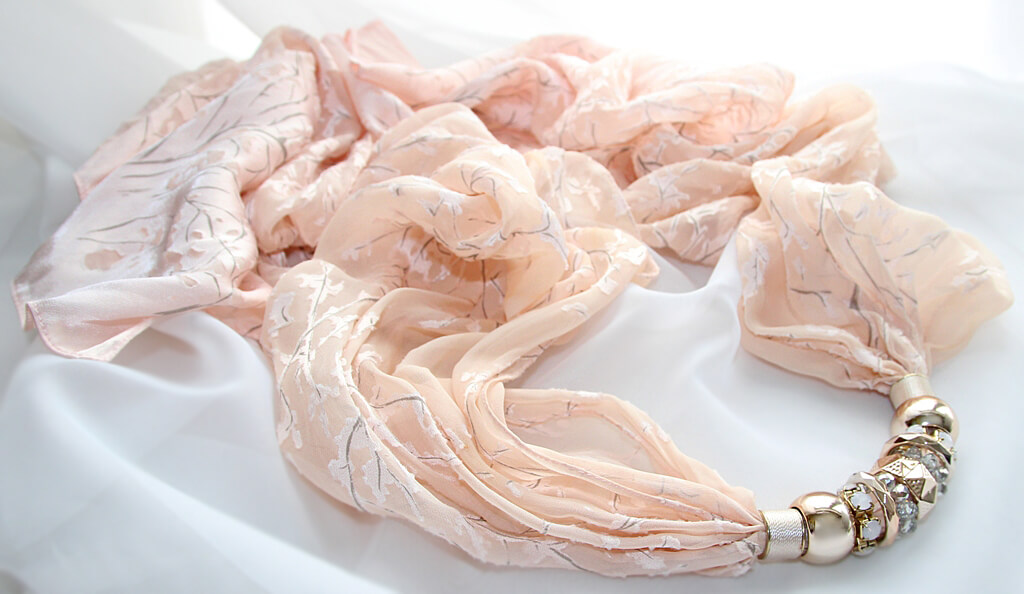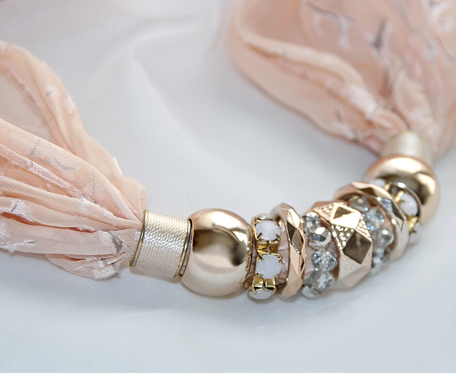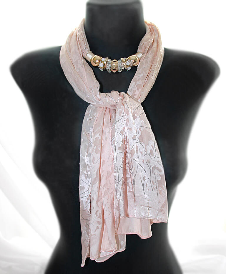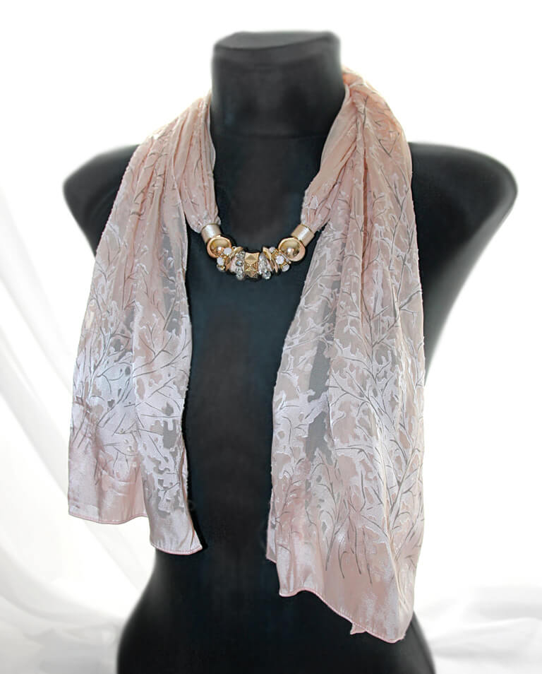 Õrnroosast (nude tooni) polüesterkangast sall erinevate roosa kulla värvi läikivate metallrõngaste ja kaunistusdetailidega. Detailid on sallil “lahtiselt” ning neid saab erinevat moodi “komplekteerida” kandes neid kas kõik koos ühtse reana või ka detailid eraldi paigutatuna. Kaunilt langeva pool-läbipaistva reljeefse oksamustriga salli laius on 308 cm, pikkus 150 cm.