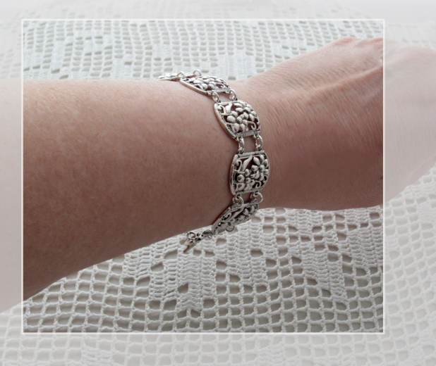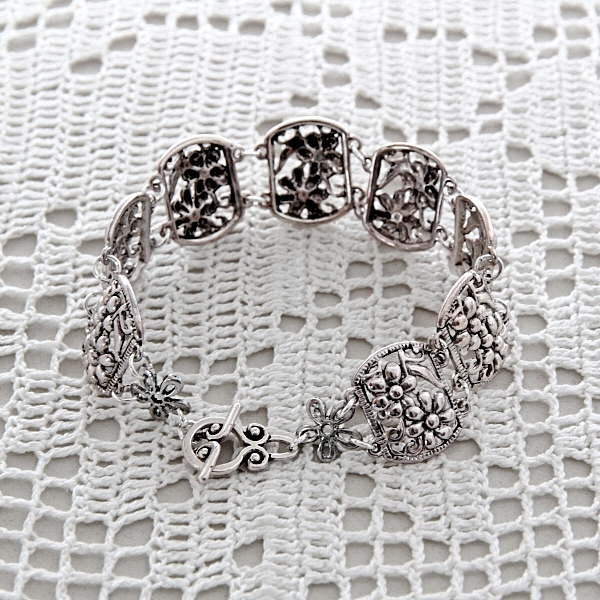 Neljakandilistest lillemotiividega pitsilistest metalldetailidest antiikhõbedavärvi käevõru
