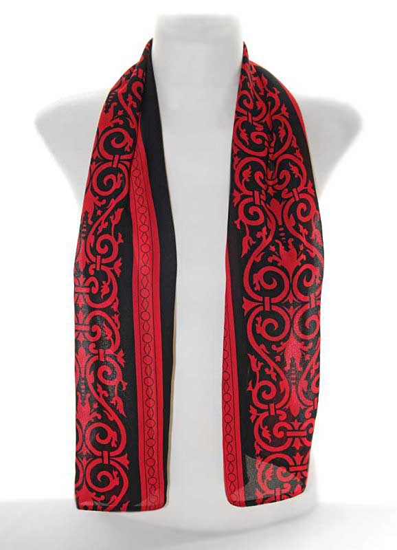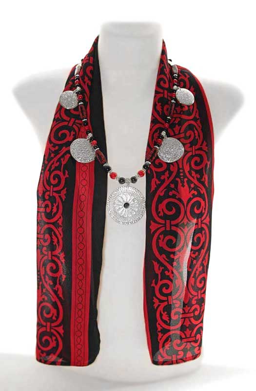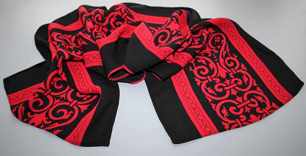 Mulgimaa meestekuube kaunistava tikandi motiividel polüesterkangast sall komplektis suurte metallripatsite ja puna-mustadest helmestest rahvuslikel ainetel kaelaehtega.