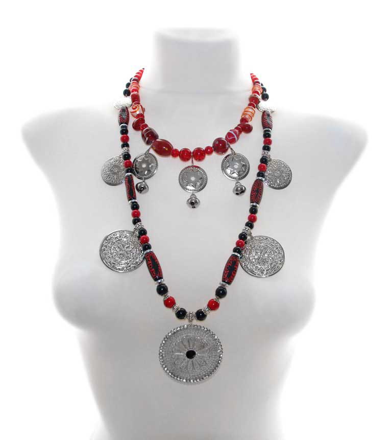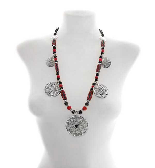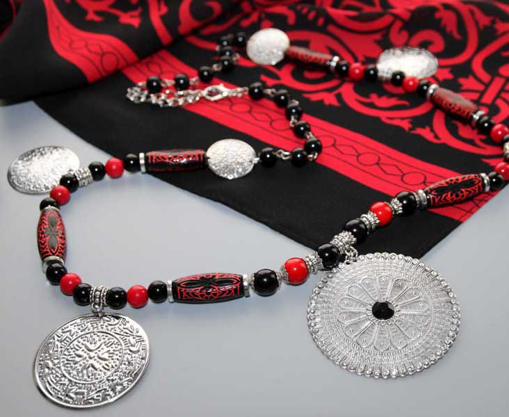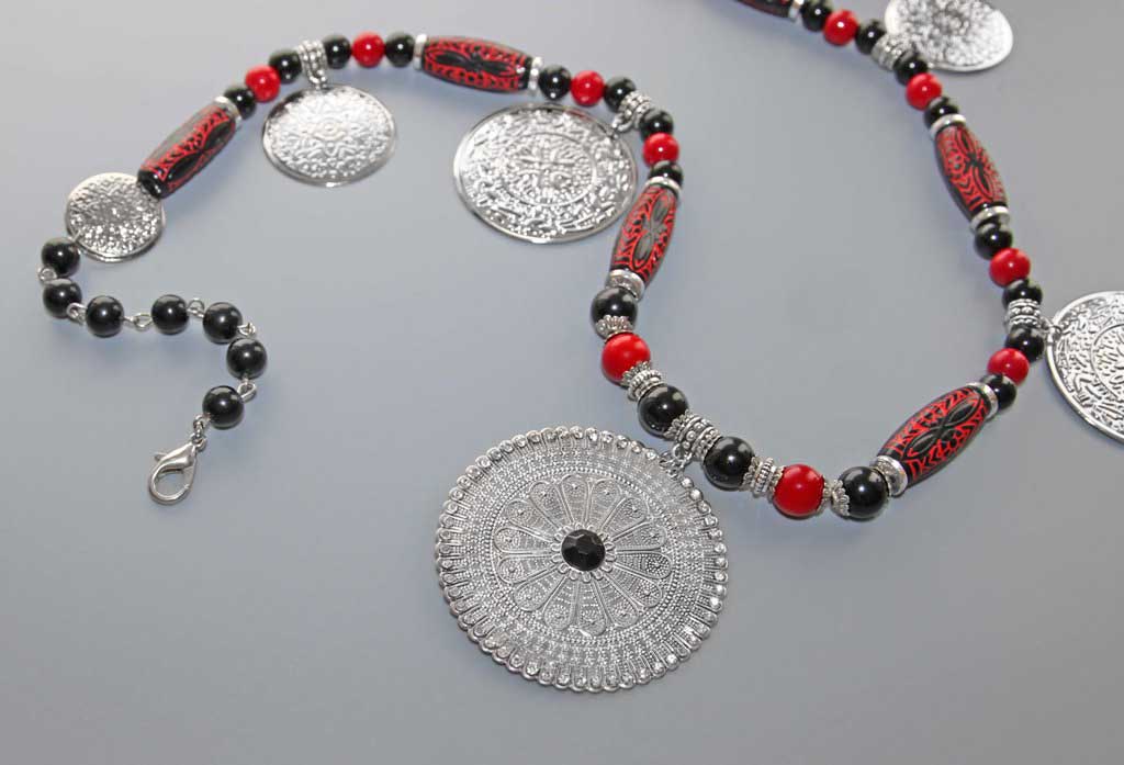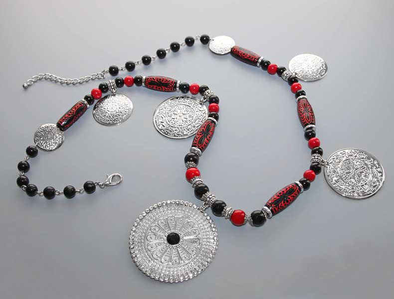 Kaelaehtes on kasutatud õhukesest hõbedavärvi reljeefse sissepressitud mustriga metall-lehest erinevas suuruses ripatseid, punaseid ja musti klaashelmeid, hõbedavärvi vahehelmeid ning piklikke musta-punasekirjusid kaunistusdetaile. Keskmise suure metallripatsi äär on kaunistatud tillukeste säravate klaaskristallidega, detaili keskel must tahuline kristalli meenutav helmes. Ripatsi diameeter on 5,5 cm.