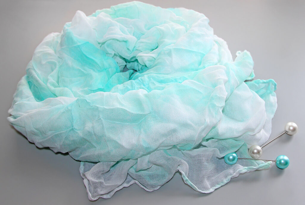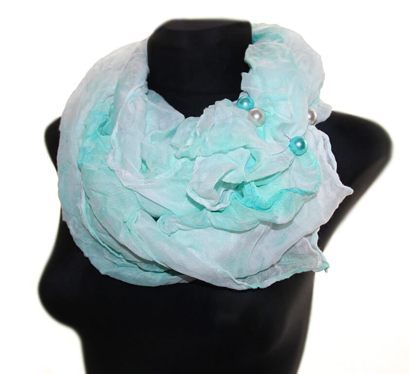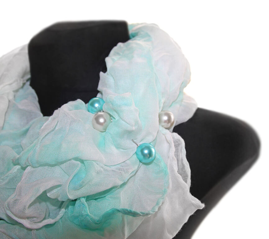 Mündivärvi valgekirjust viskooskangast batika tehnikas värvitud suuremat sorti sall kahe pärlitest kaunistusnõelaga. Salli kangas on efektselt ja üsna tugevalt kortsutatud.