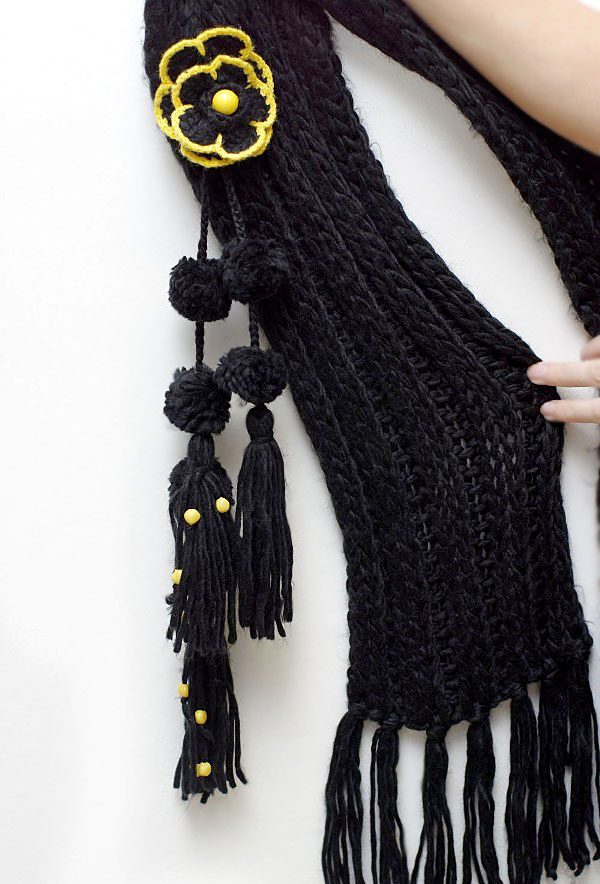 Pehmest süsimustast akrüül-lõngast kootud pikk sall tuttide, kollaste helmeste ja heegeldatud lillega.