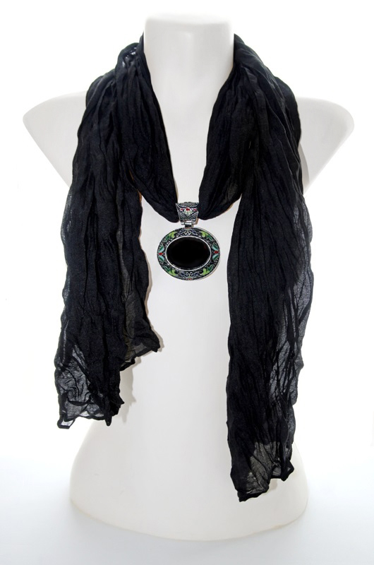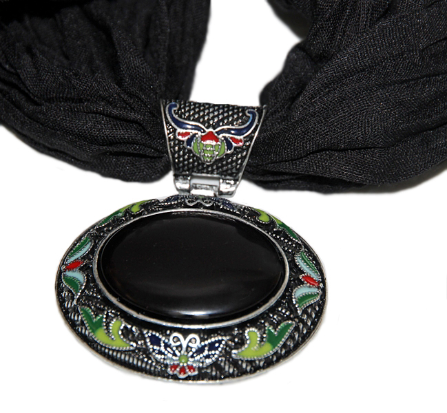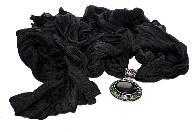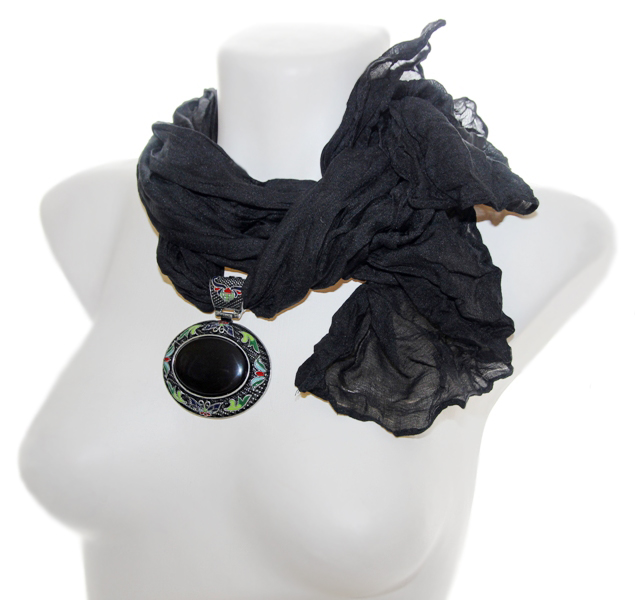Musta värvi pehmest viskooskangast pikk sall suure musta akrüülist kameeripatsiga.