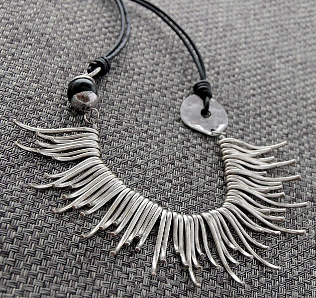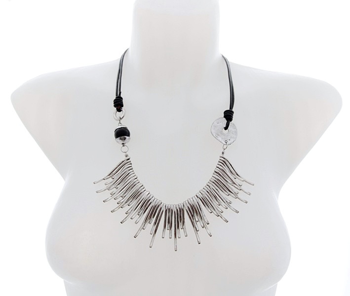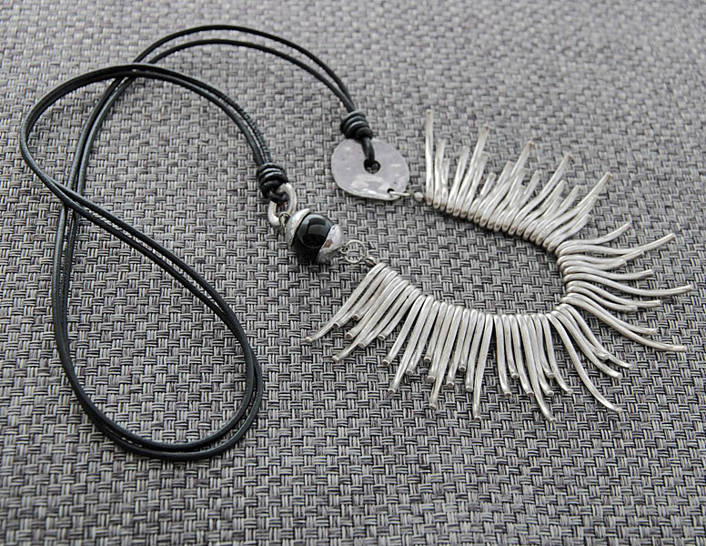 Vanahõbedavärvi metalldetailide ja musta nahkpaelaga kaelaehe