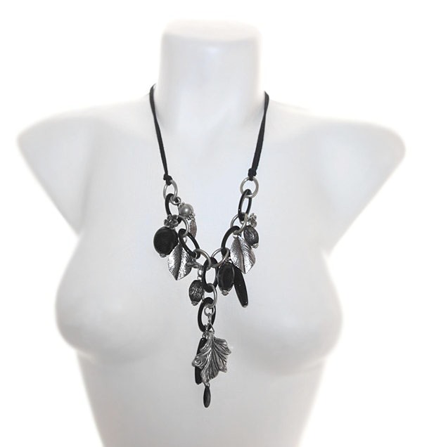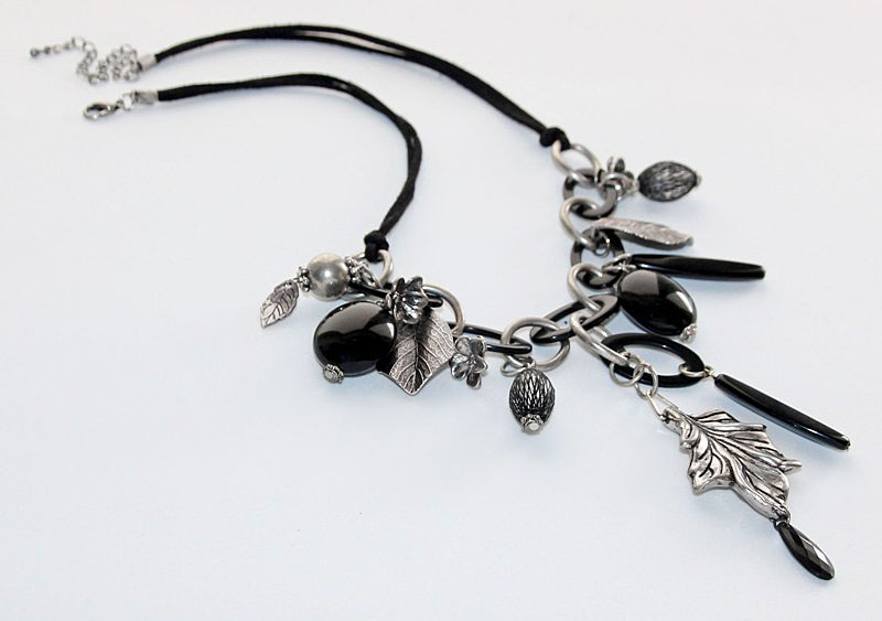 Musta nahkpaela, ovaalsete rõngaste ja erinevate ripatsitega kaelakee