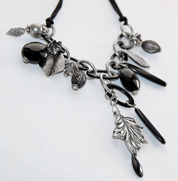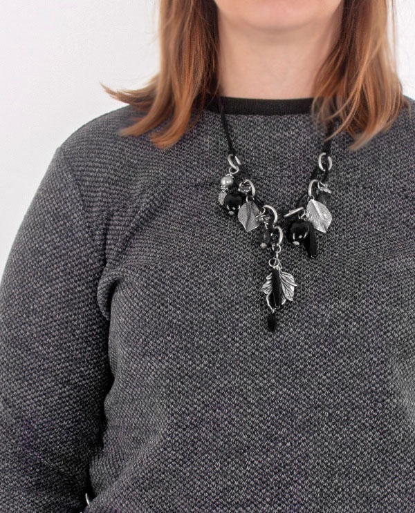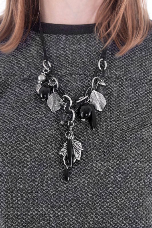 Musta seemisnahkse paela, suurte ovaalsete rõngaste ja paljude erinevate mustade helmeste ja erikujuliste metallripatsitega kaelakee. Mustade akrüülrõngaste ja vanahõbedavärvi metallrõngaste külge on kinnitatud erineva kuju ja suurusega musti helmeid ning lille- ja lehekujulisi vanahõbedavärvi metallripatseid.