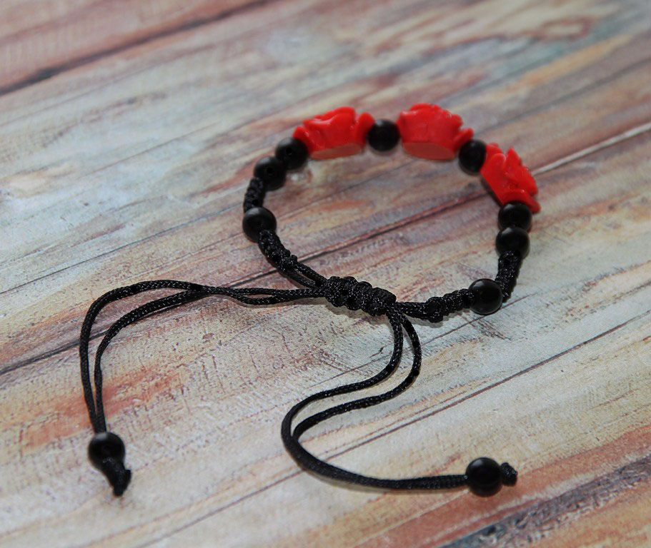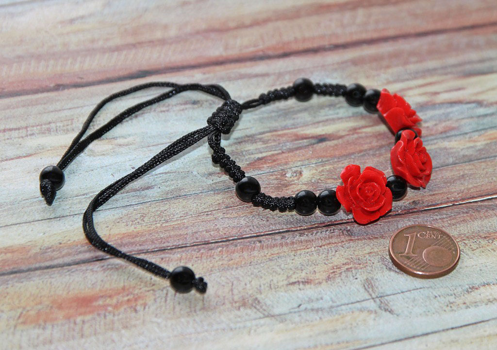 Erkpunaste kunstvaigust rooside ja väikeste mustade akrüülhelmestega käevõru musta nööriga.
