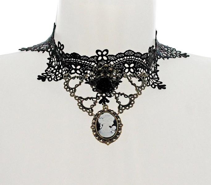 Laia musta pitsi, pronksivärvi pitsilise kaunistusdetaili, väikese musta kunstvaigust roosi ja vintage stiilis kameega kaelaehe