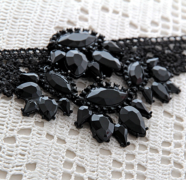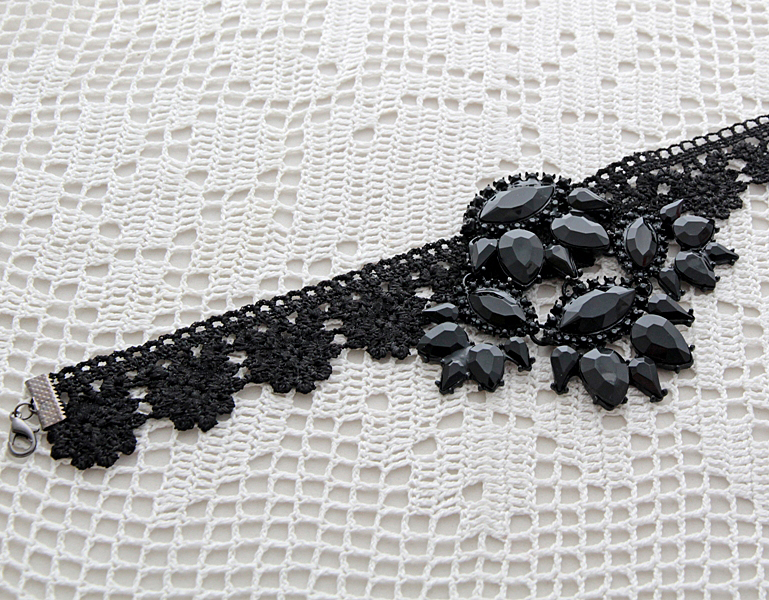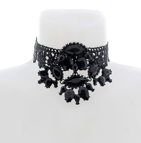 Musta pitsi ja efektse metallist musta värvi suure kaunistusdetailiga choker (ümber kaela) stiilis kaelaehe. Kaelaehte pitsiline metalldetail on kaunistatud tahuliste tilgakujuliste akrüülkameedega. Pitsi pikkus on 28 cm, metallist kaunistusdetaili mõõdud on 8,5 cm x 10 cm.