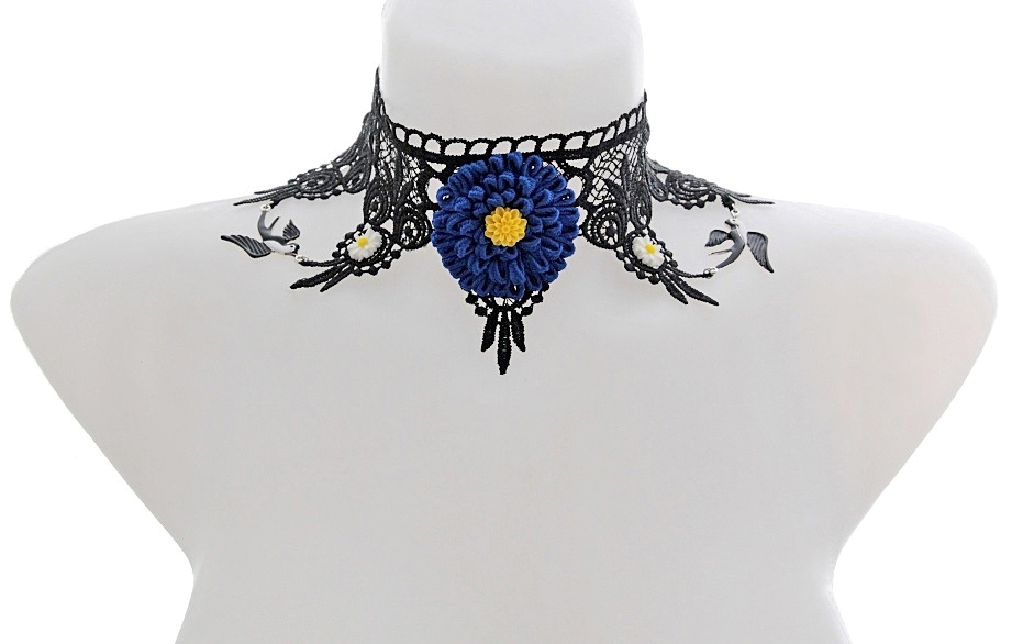 Laia musta pitsi, stiliseeritud sinise sutaššpaelast rukkilille ja kahe suitsupääsukesekujulise metallripatsiga choker stiilis (ümber kaela) kaelaehe. Rukkilille südamikuks väike kollane kunstvaigust lilleke, pitsil kaks väikest karikakrakujulist kunstvaigust kaunistust. Kaelaehte pitsist osa pikkus on 35 cm, hõbedavärvi pikendusketi abil on pikkusele võimalik lisada 4 cm. Kergelt läikiva tugeva pitsi laius on 8 cm, rukkilille diameeter on 5 cm. Hõbedavärvi linnukujulised ripatsid on käsitsi üle värvitud valge ja musta metallvärviga