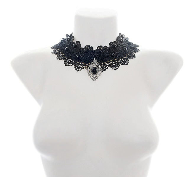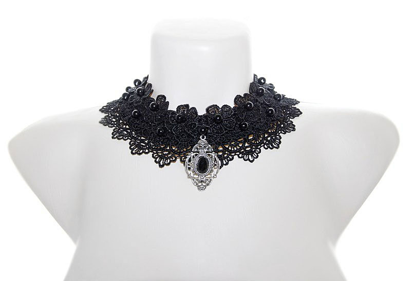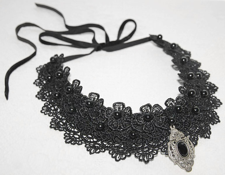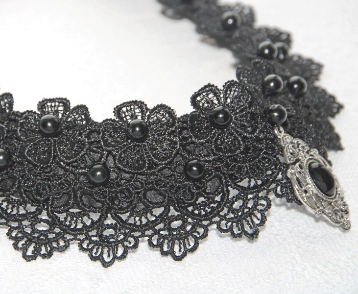 Mustade pärlite ja rahvuslikel ainetel antiikhõbedase metallkaunistusega efektne mustast pitsist kaelaehe komplektis kõrvarõngastega. Kaarjas pitsdetail ja pärlid on tikitud mustale vildist alusele, tagumine osa töödeldud puuvillase kangaga.