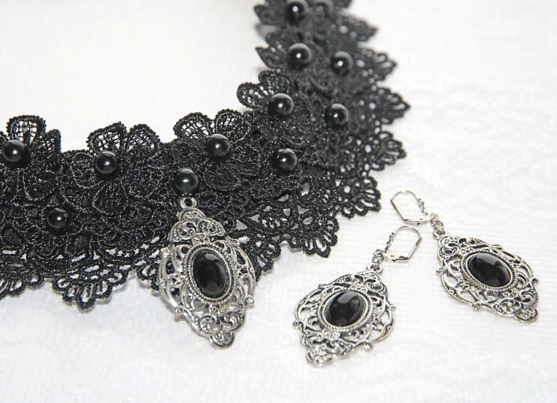 Musta pitsi ja antiikhõbedaste metallripatsitega komplekt kaelaehte ja kõrvarõngastega
