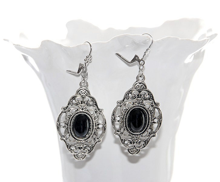 Komplekti kuuluvate musta akrüülkameega pitsiliste antiikhõbedaste metallripatsitega kõrvarõngaste pikkus koos inglise lukuga on 7 cm.