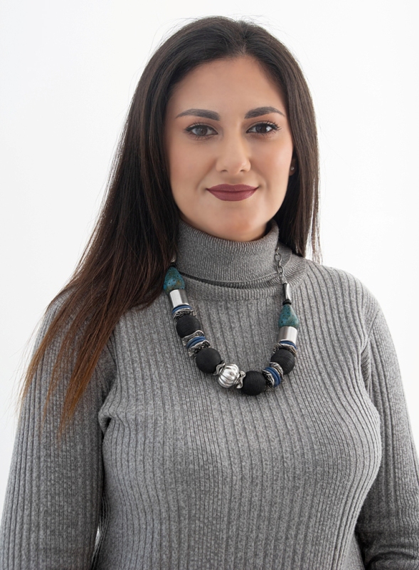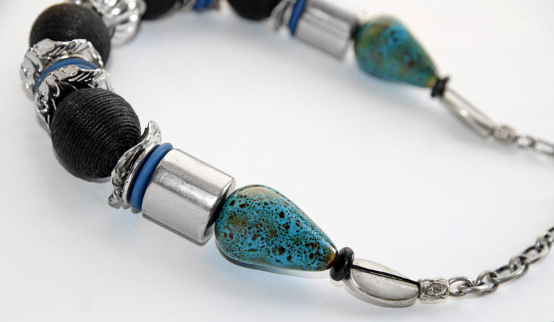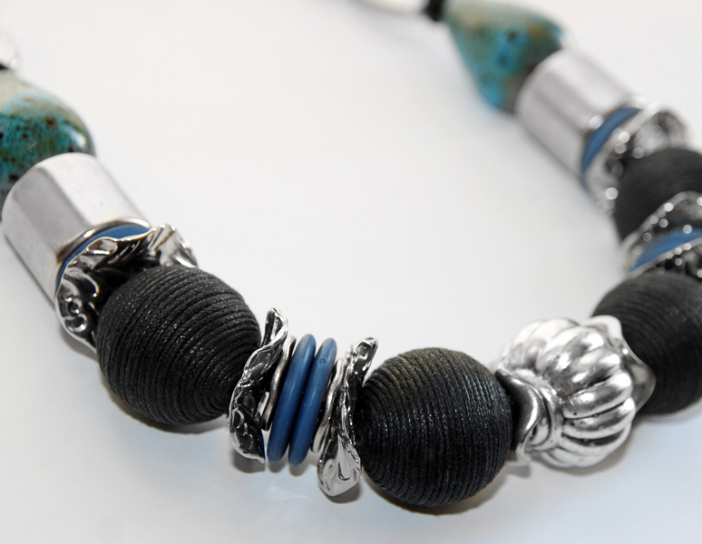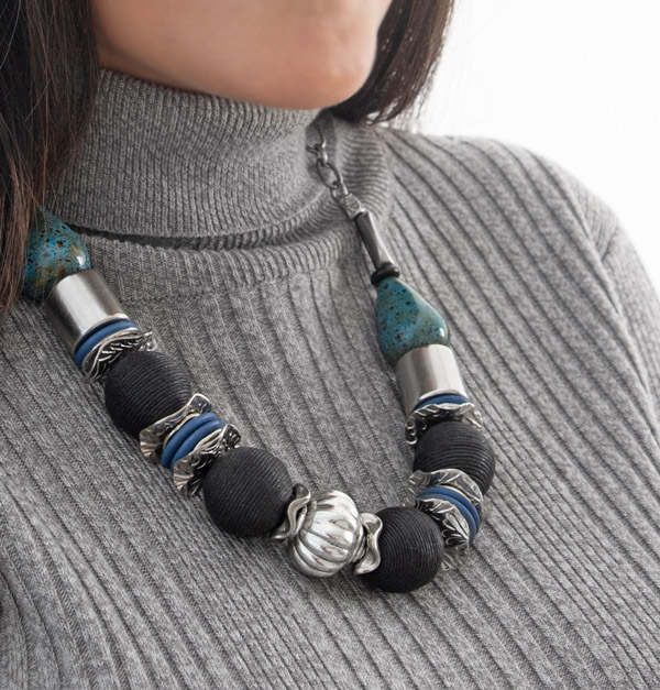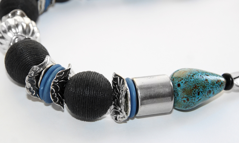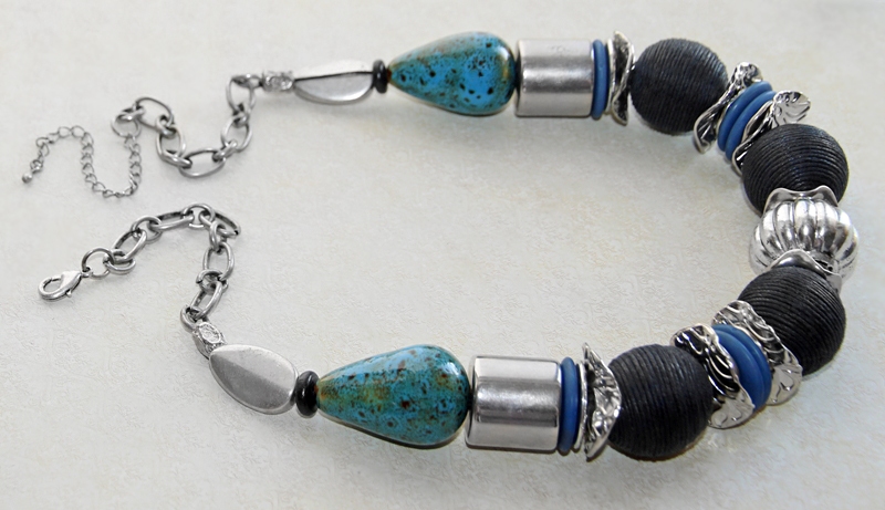 Erineva suuruse ja kujuga hõbedavärvi metallhelmeste, musta nööriga kaetud puust helmeste, tilgakujuliste keraamiliste helmeste ja siniste akrüülseibidega kaelakee. Etno stiilis kaelakee pikkus on reguleeritav suuremat sorti tugeva vanahõbedavärvi keti ja igasse ketilülisse kinnitatava karabiinhaagiga kuni 64 cm-ni. Helmestega osa pikkus on 37 cm.