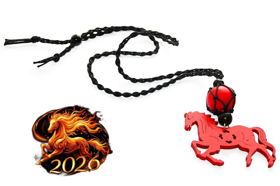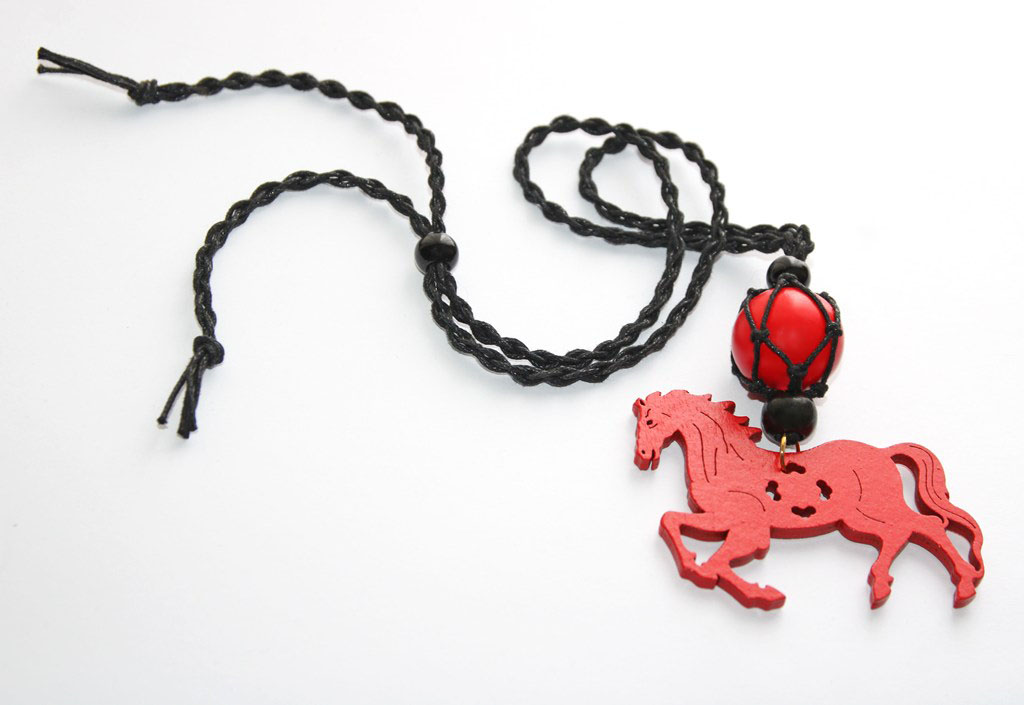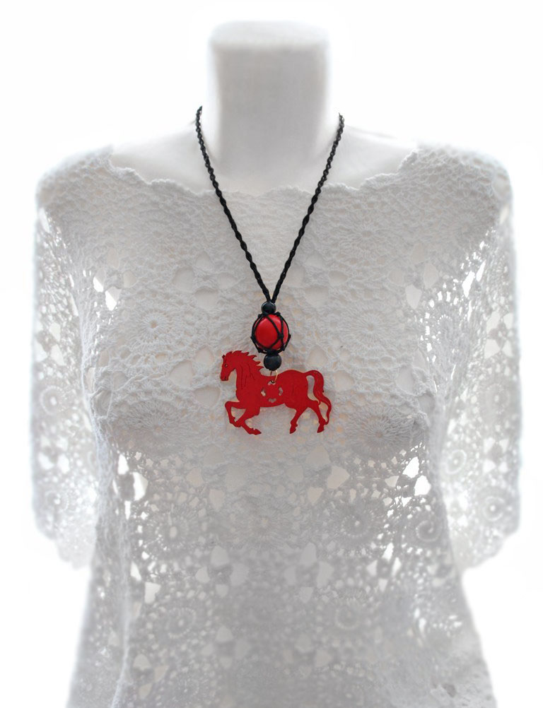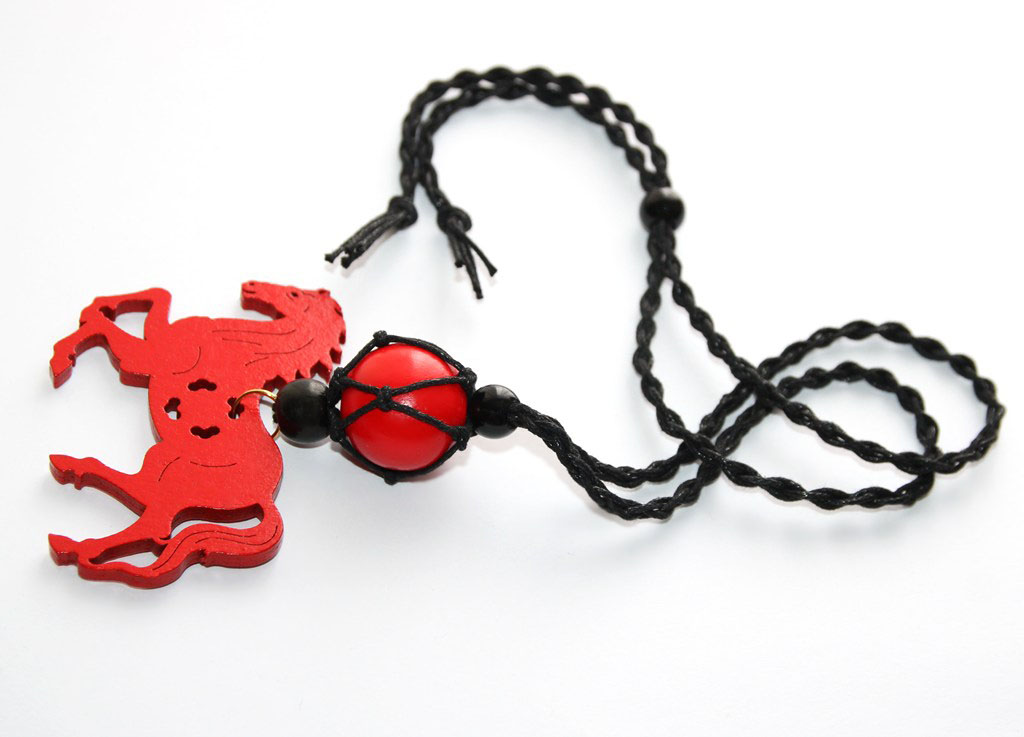 Mustast puuvillanöörist võrkpunutise, suure punase puidust hobusekujulise ripatsi ja puuhelmestega kaelaehe.