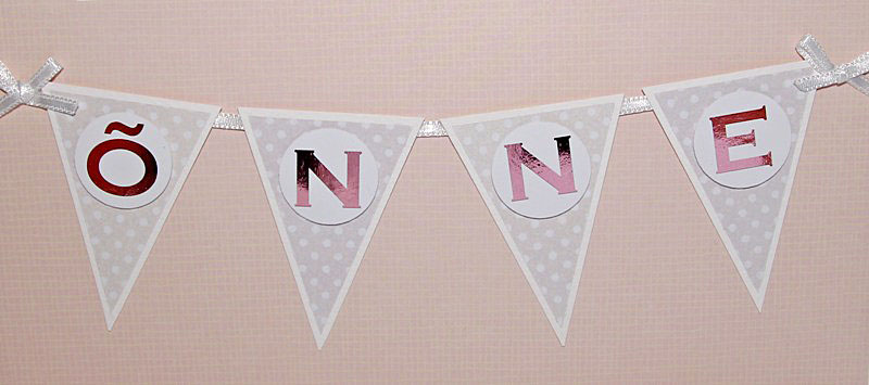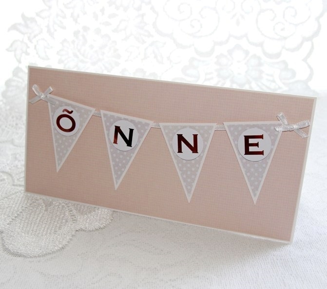 Kahepoolne valgest kartongist õnnitluskaart pastellroosa esiosa ja tagakülje ning kolmnurksete täpiliste lipukeste reaga valgel peenikesel atlasspaelal. Reljeefsed tähed lipukestel on fooliumtrükis, mis erineva valguse käes läigivad heleroosast tumeroosani.