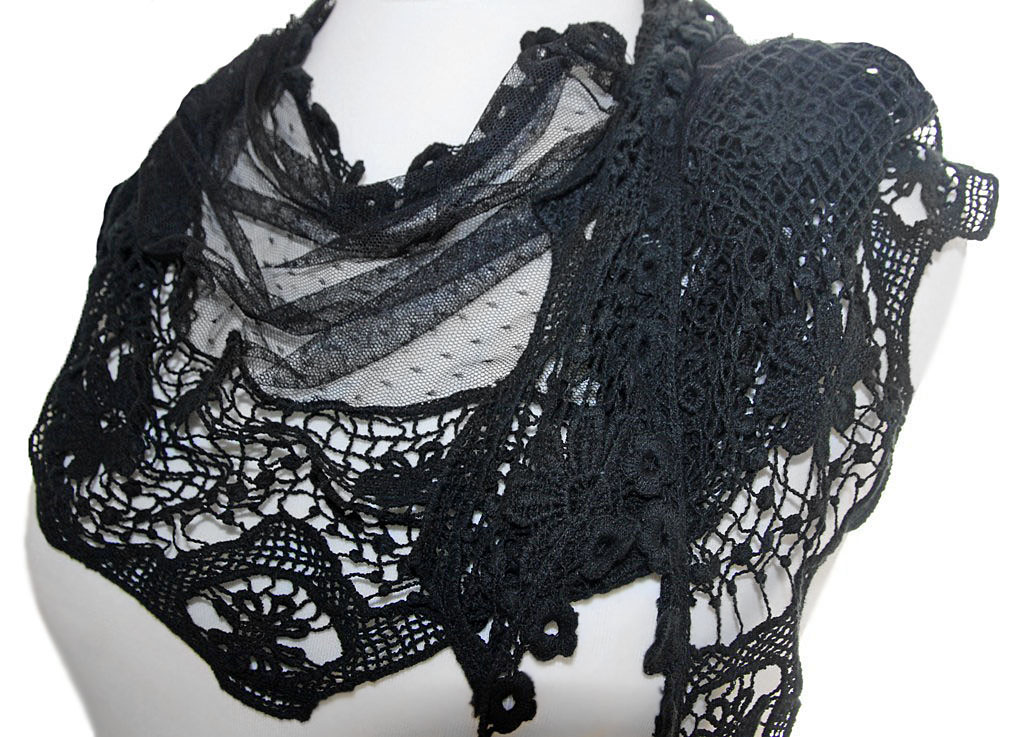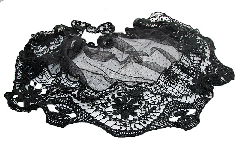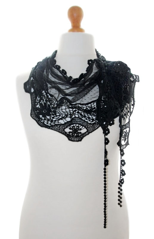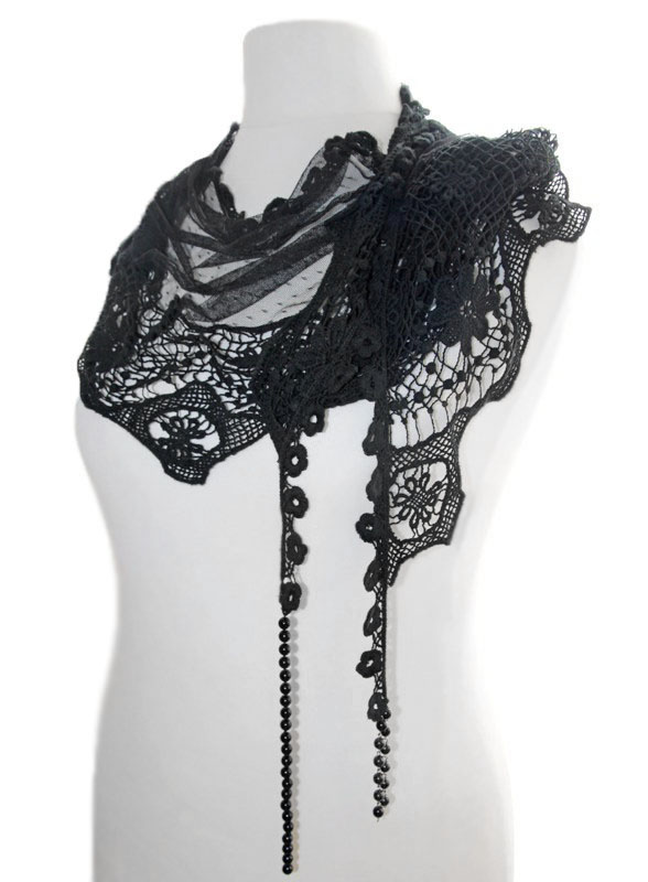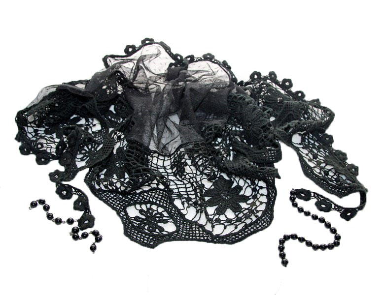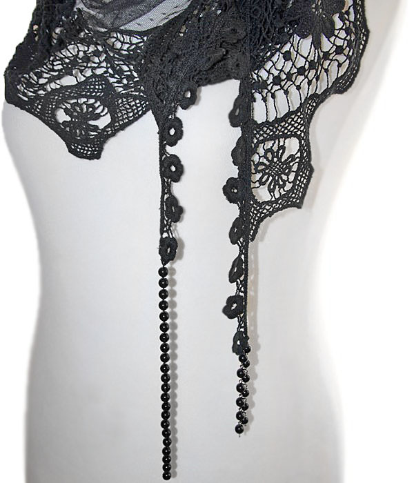 Puuvillasest pitsist laiade äärte ja pärlikeest kaunistusdetalidega musta värvi õrnast tüllist sall. Sall on otstest ahenev, salli otstesse on kinnitatud mustadest klaaspärlitest “ketid”.