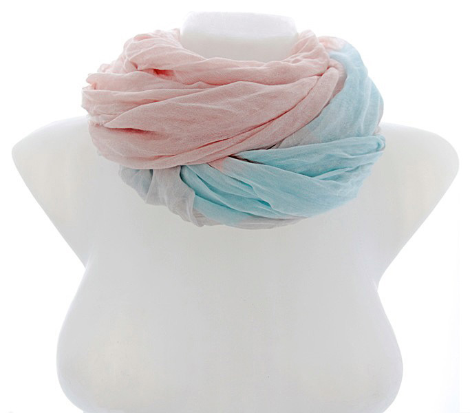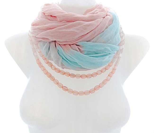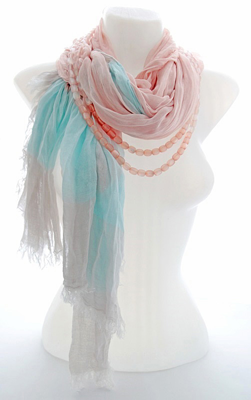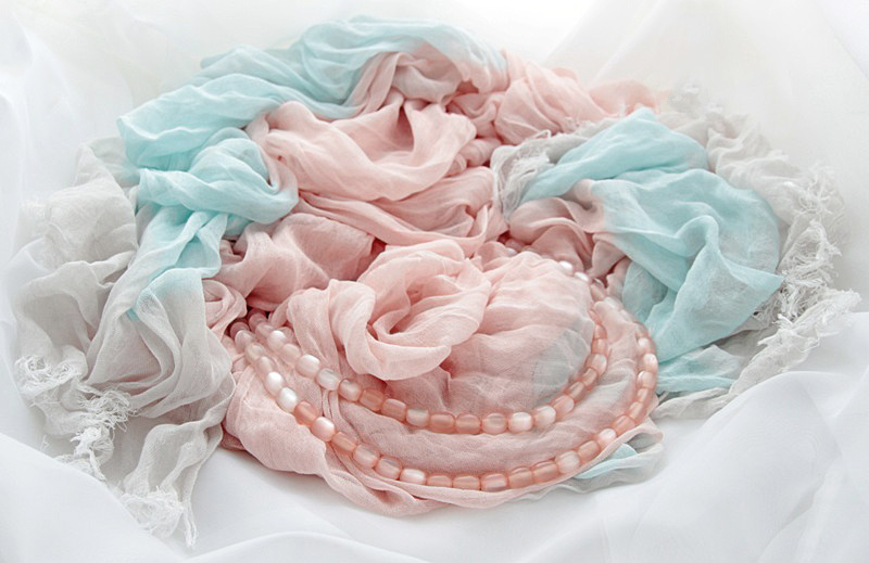 Õrnades virsikuvärvi ja helesinistes pastelltoonides puuvilla- ja viskoosisegu kangast suuremat sorti sall efektse kaherealise sulanduvates virsikuvärvi toonides kassisilmakividest keega. Mõnusalt pehme ja õhulise salli kangas on kergelt kortsutatud, otsad narmastatud. Salli mõõdud on 95 cm x 195 cm.