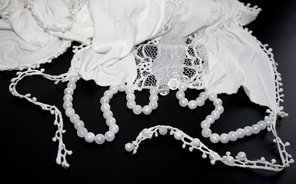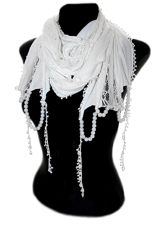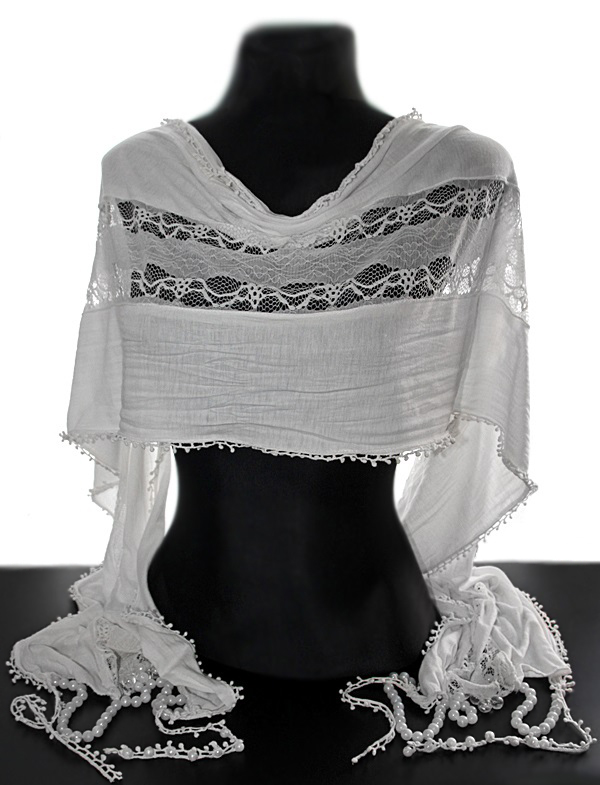Pehmest puuvilla-, viskoosi- ja elastaanisegu õhukesest naturaalvalgest kangast sall pitskaunistuse ja pärlikeest “narmastega”. Salli keskele (kuni alläärteni) on õmmeldud õhuke polüester(stretš)pits. Salli külgedel puuvillane väikeste “mummudega” puuvillane pits, otstes käsitsi õmmeldud valgetest pärlitest kaunistuskeed.
