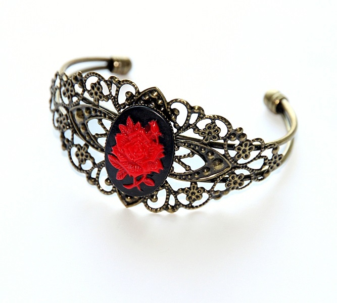 Pronksivärvi pitsiline käevõru erkpunase roosimotiiviga kaunistatud musta kunstvaigust kameega. Kamee suurus on 18mm x 25mm.