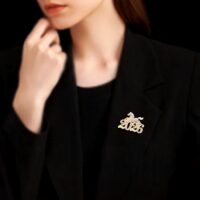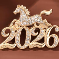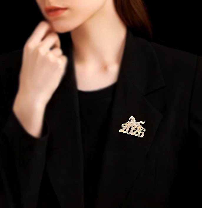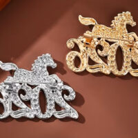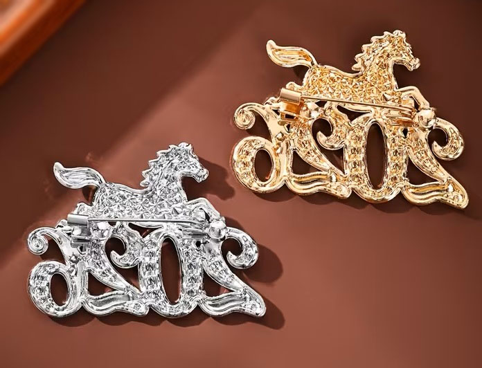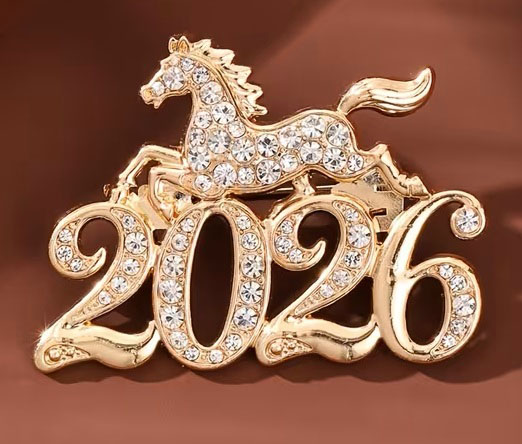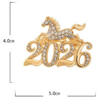 Kaunilt säravate läbipaistvate klaaskristallidega kaunistatud kappava hobuse kujulise detailiga hobuseaasta 2026 temaatiline pross.