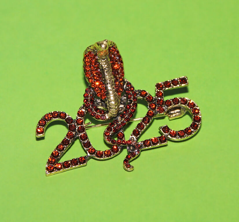 Heledamat ja tumedamat tooni kuldpruunide klaaskristallidega kaunistatud kobrakujulise detailiga maoaasta 2025 temaatiline pross.