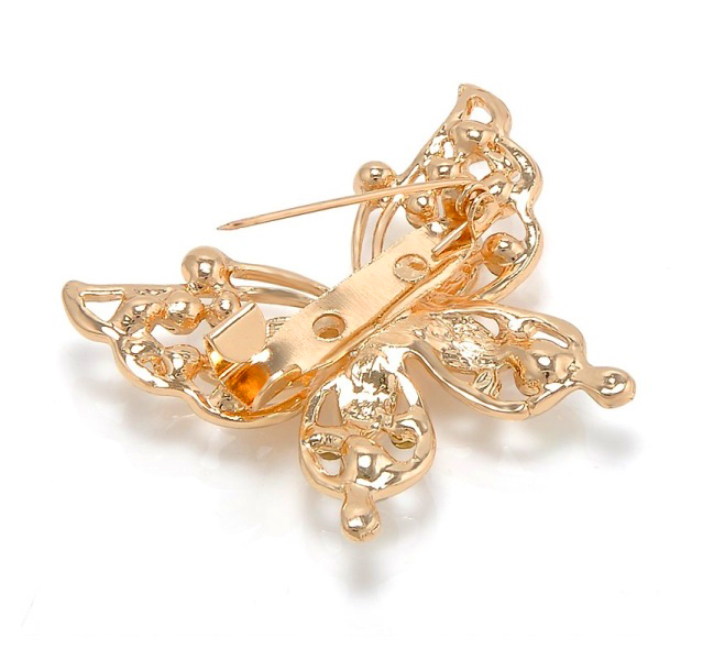 Säravate klaaskristallide ja punaste tilgakujuliste akrüülist kaunistustega liblikakujuline metallist väike kullavärvi pross.