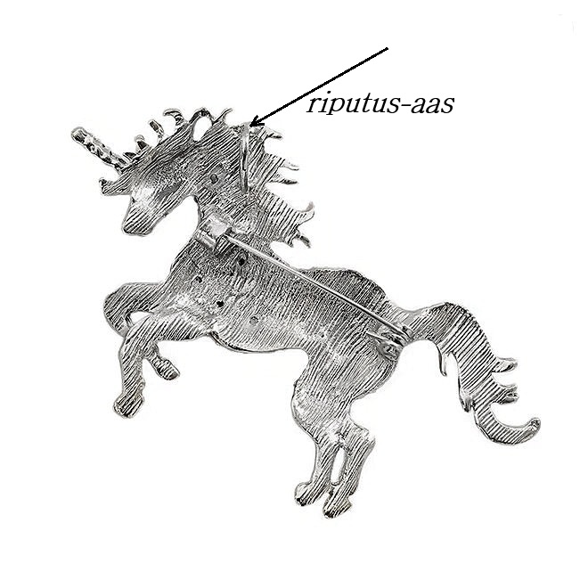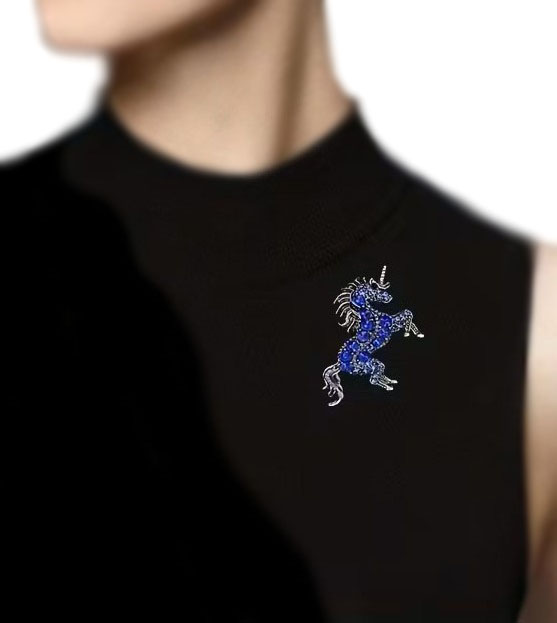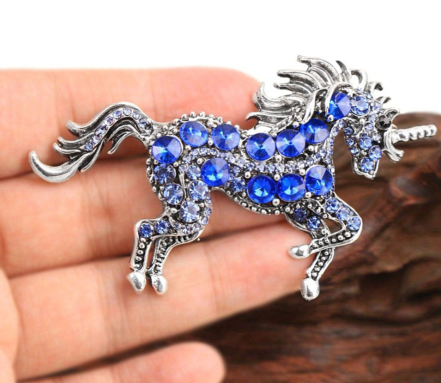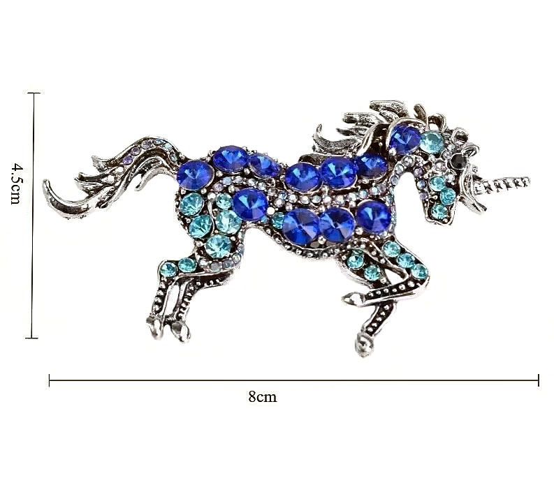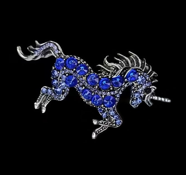 Säravate taevasiniste ja kuningsiniste klaaskristallidega kaunistatud ükssarviku motiiviga antiikhõbedavärvi metallpross.