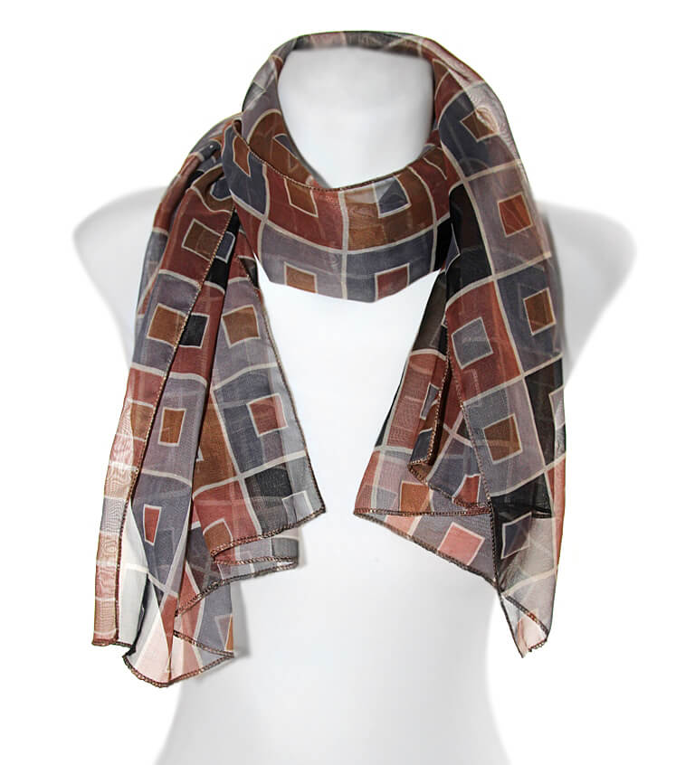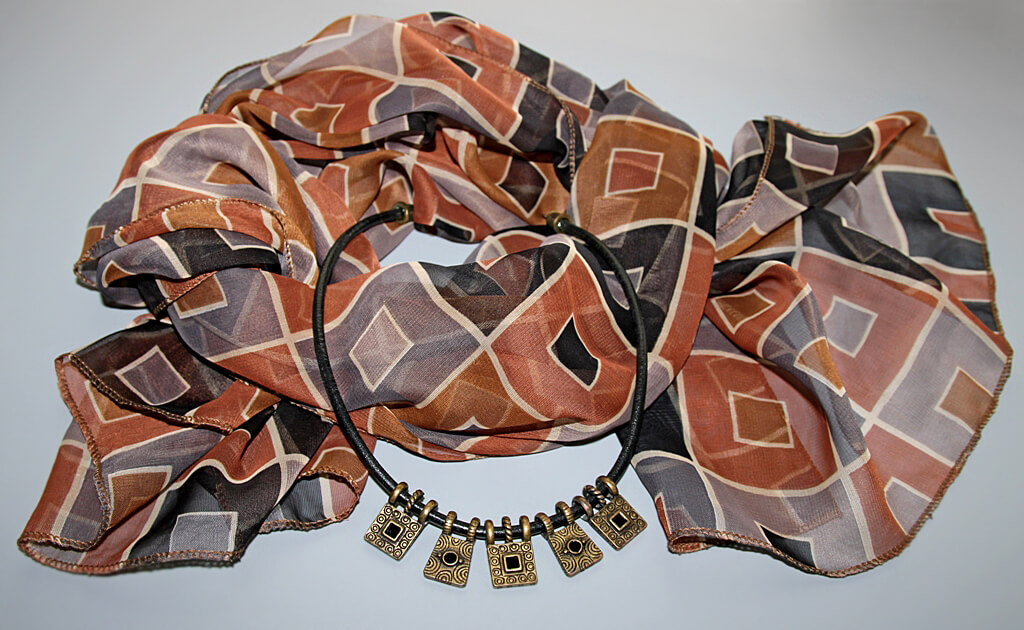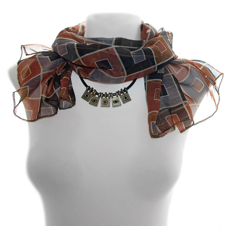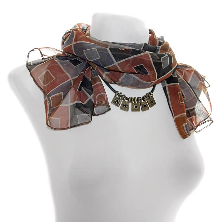 Pruuni-hallikirju ruudumustriline polüesterkangast sall komplektis ruudukujulistest pronksivärvi metalldetailisest kaelaehtega.