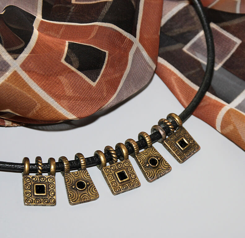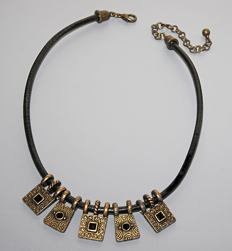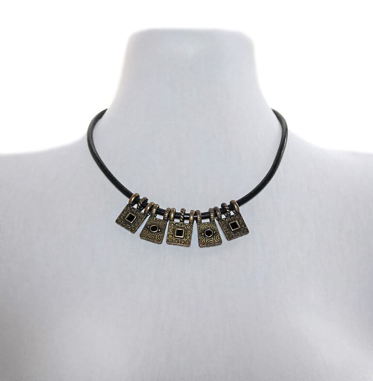 Reljeefse etno stiilis mustriga metalldetailid on kaunistatud väikeste mustade klaaskristallidega. Jämedamat sorti musta nahkpaelaga kaelaehte pikkus on reguleeritav pronksivärvi karabiinhaagi ja keti abil 42 cm-st kuni 50 cm-ni.