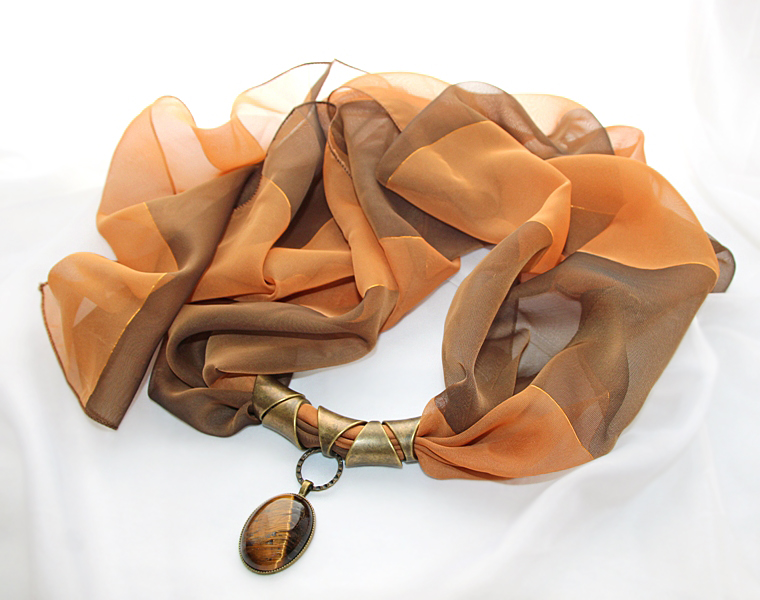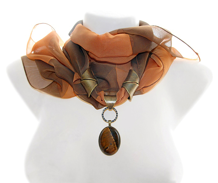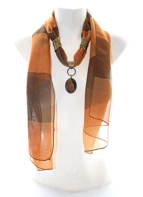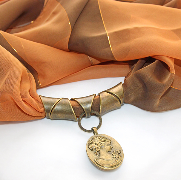 Pruunides-terrakotatoonides õhukesest polüesterkangast sall pronksivärvi kolmnurksete sallirõngaste ja kahepoolselt kantava vintage stiilis ripatsiga. Metallripatsi ühel poolel on reljeefne renessansiaja daami portree, teisel poolel suur looduslikust tiigrisilmakivist kamee. Kamee suurus on 3 cm x 4 cm, ripatsi pikkus koos mustrilise kaunistusrõngaga on 7 cm.