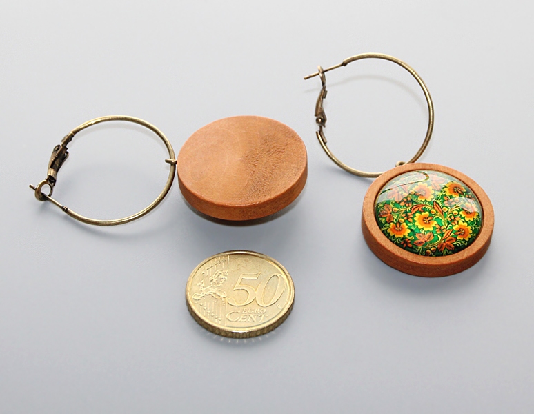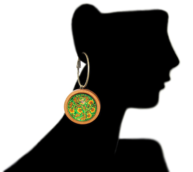 Heledast puidust aluse ja kollastes-rohelistes toonides rahvusliku tikandi motiividel lillemustrilise klaaskameega kõrvarõngad.