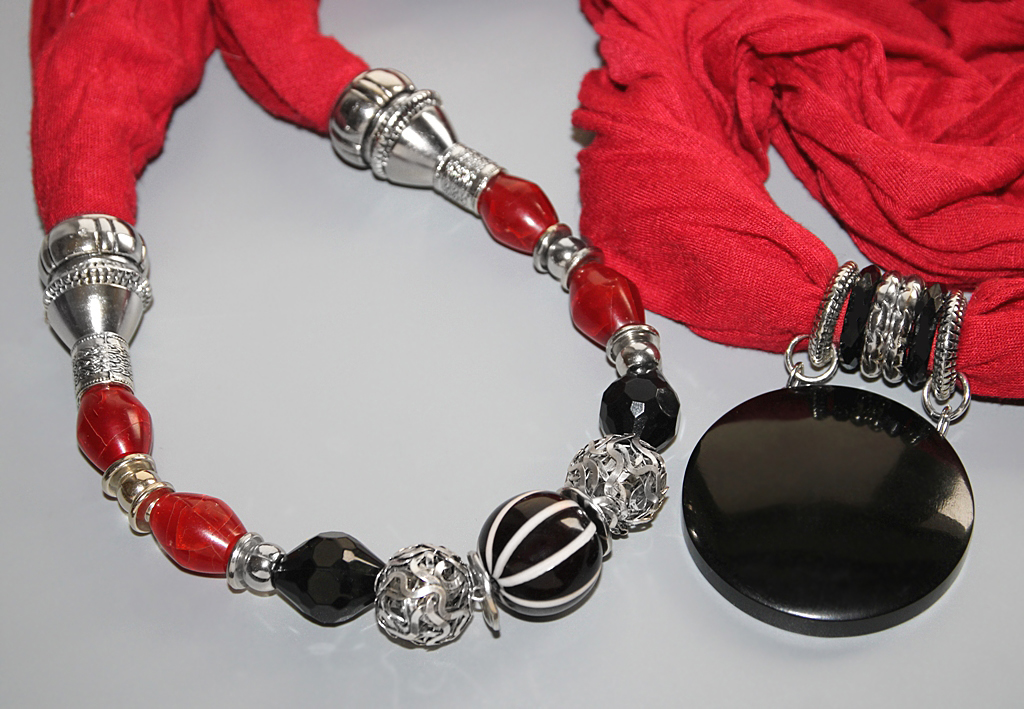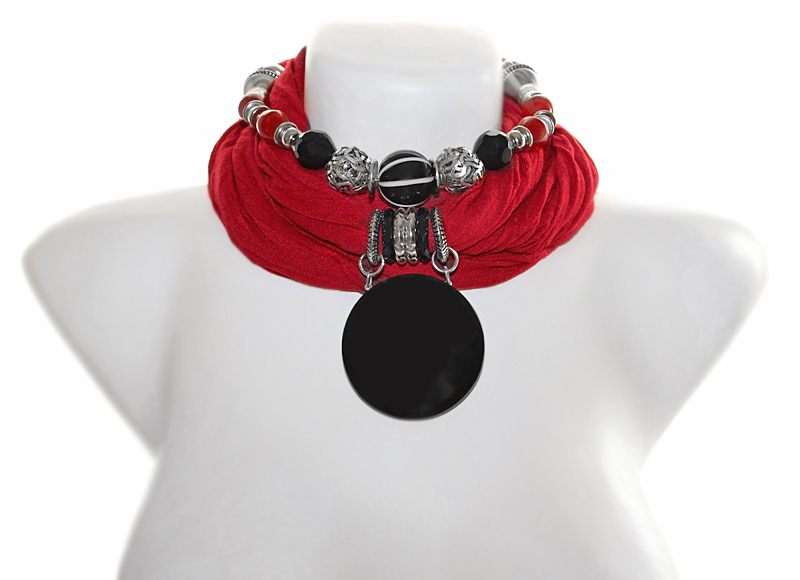 Hõbedavärvi metallhelmestega otstesse kinnitatud punastest ja mustadest akrüülhelmestest kee ning suure ümmarguse musta ripatsiga trikotaažkangast pikk rull-sall.