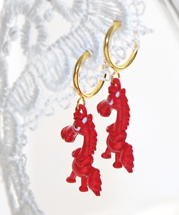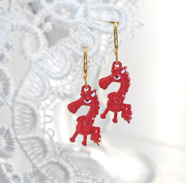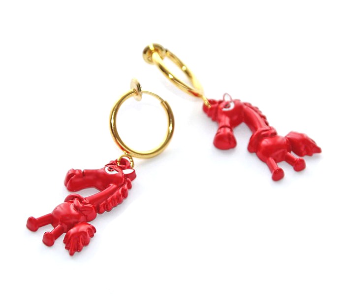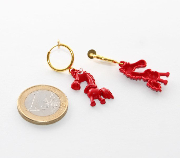 Rõngaste külge on kinnitatud humoorikalt arrogantse välimusega väike punane hobusekujulise metallripats. Ripatsi mõõdud on 2,5 cm x 2,5 cm.