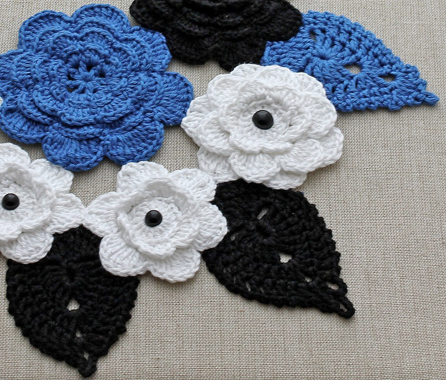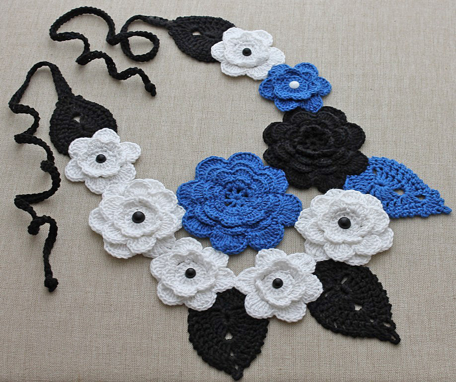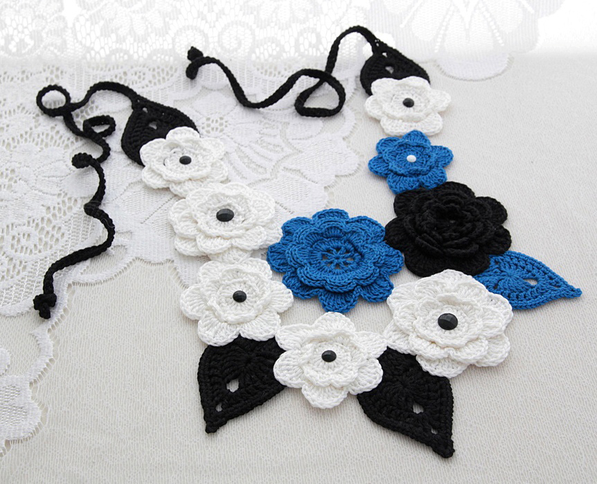 Efektne suur mustast, valgest ja sinisest puuvillasest lõngast heegeldatud lehe- ja lillemotiividega rahvuslik kaelaehe