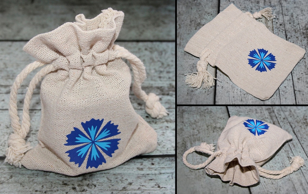 Ehtekomplektiga on kaasas väike rukkilillemotiiviga naturaalset tooni linane ehtekotike. Rukkilillemotiiv on kotikesele kuumtöötlusega käsitsi (mitte trükina) peale kantud ning kotikest on võimalik ka pesta ilma, et “värv laiali läheks”. Kotikese suu on kinnitõmmatav jämedamat sorti tugeva keerutatud nööriga, mistõttu saab kotikese kinnitada ka vöö külge ning kasutada seda stiilse mündikotina rahvarõivaste juurde sobiva aksessuaarina. Kotikese väikeste mõõtude tõttu (9 cm x 11,5 cm) sobib see hästi just täienduseks lasterõivastele.