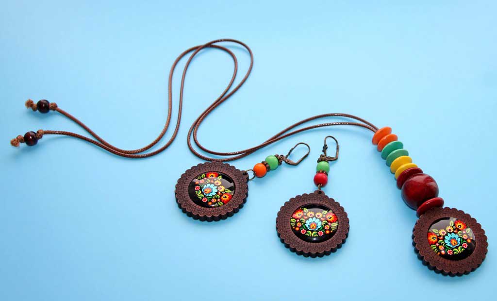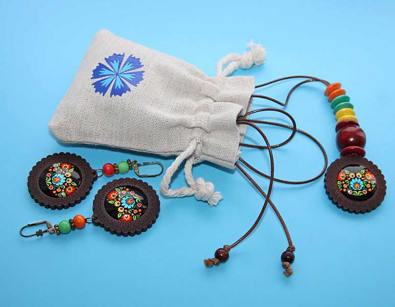 Värviliste puuhelmeste, lillemustriliste kameede ja tumepruunide puidust kameealustega rahvuslikel ainetel ehtekomplekt kaelaehte ja kõrvarõngastega rukkilillemotiiviga linases kinkekotis.