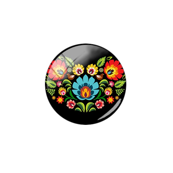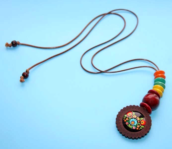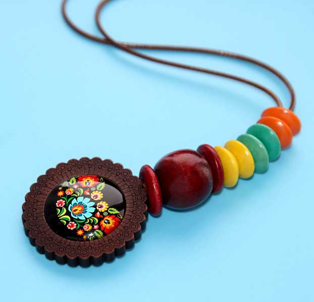 Helepruuni läikiva ja siidjalt pehme paelaga kaelaehtes on kasutatud erineva kuju, värvi ja suurusega puuhelmeid, ripatsiks tumepruunis reljeefse mustriga pitsilises puidust raamis rahvuslikel ainetel lillemustriline klaaskamee. Kaelaehte pikkuse saab otsi kokku sõlmides endale sobivaks reguleerida.