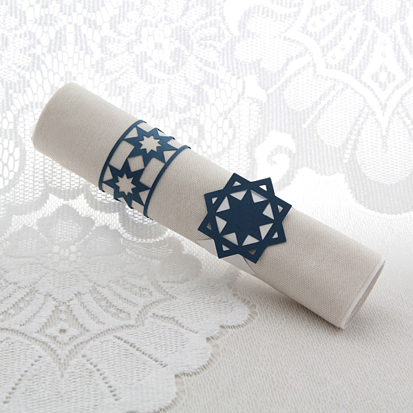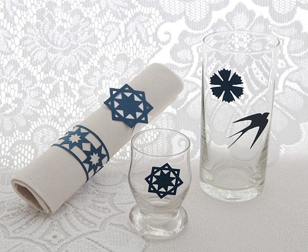 Paberist lauakaunistuste komplekt rahvuslikel motiividel kujunditega. Komplektis on salvrätikuhoidjad ja joogiklaasi või -kõrre kaunistused. Suuruse näidiseks: rukkilille diameeter on 3 cm.