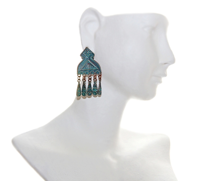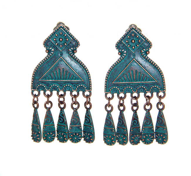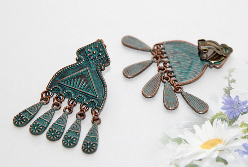 Etno stiilis reljeefse mustriga “oksüdeerunud” vase värvi metalldetaili ja väikeste ripatsitega kõrvarõngad klõpsuga.