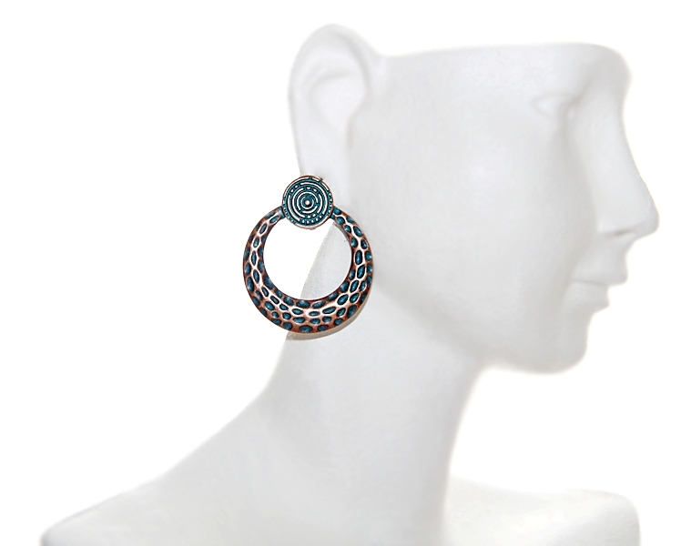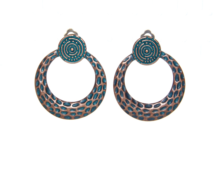 Etno stiilis reljeefse mustriga “oksüdeerunud” vase värvi ümmarguste metalldetailidega kõrvarõngad klõpsuga. Rõngas ei ole “liikuv” ripats.